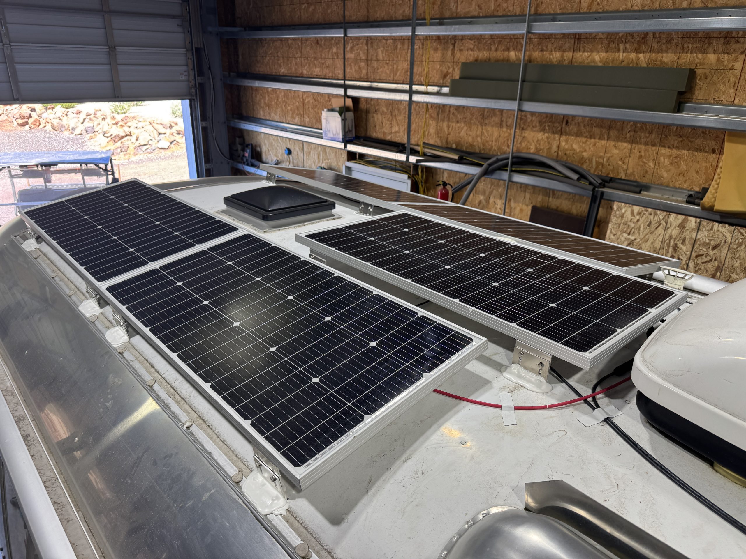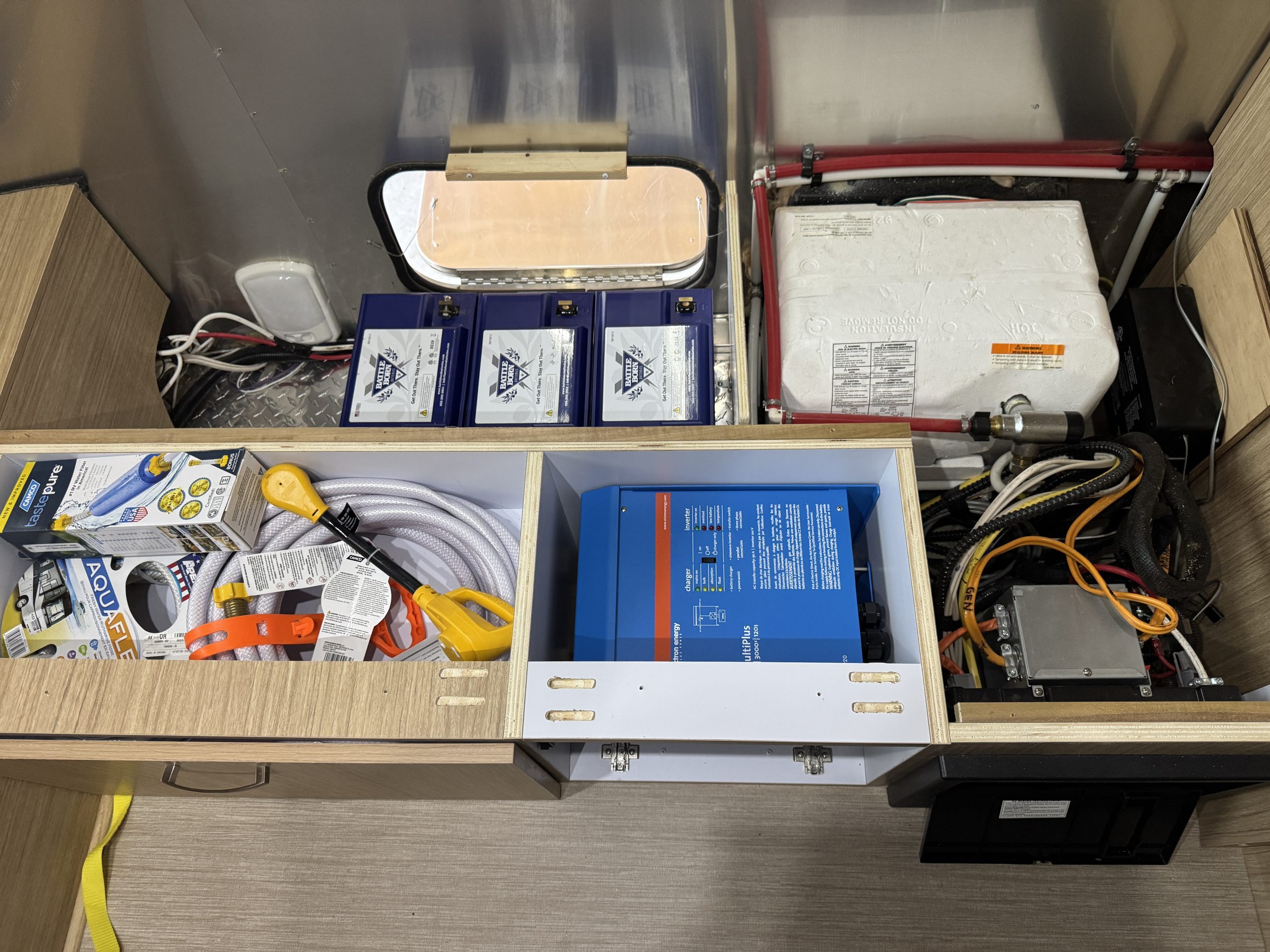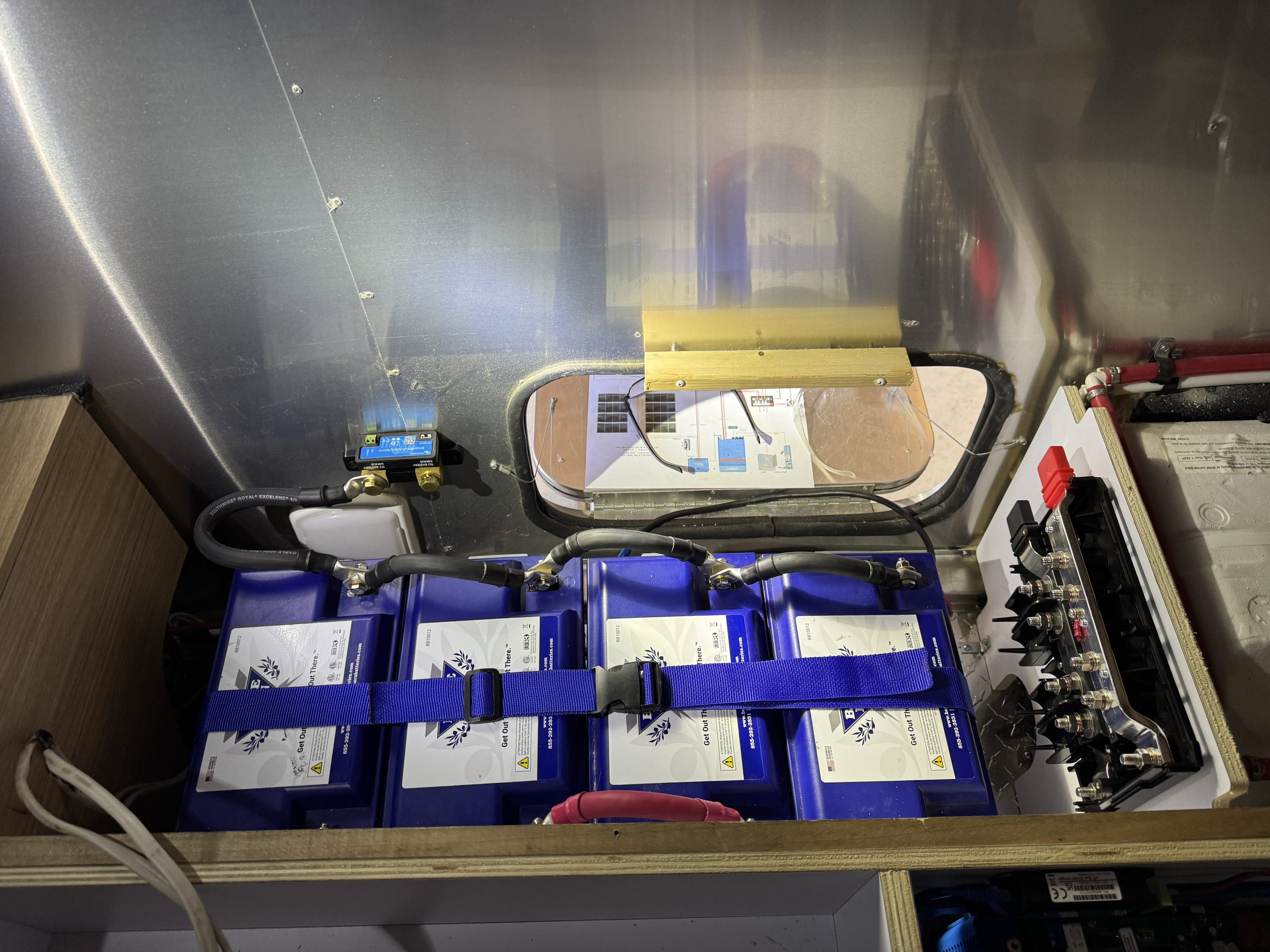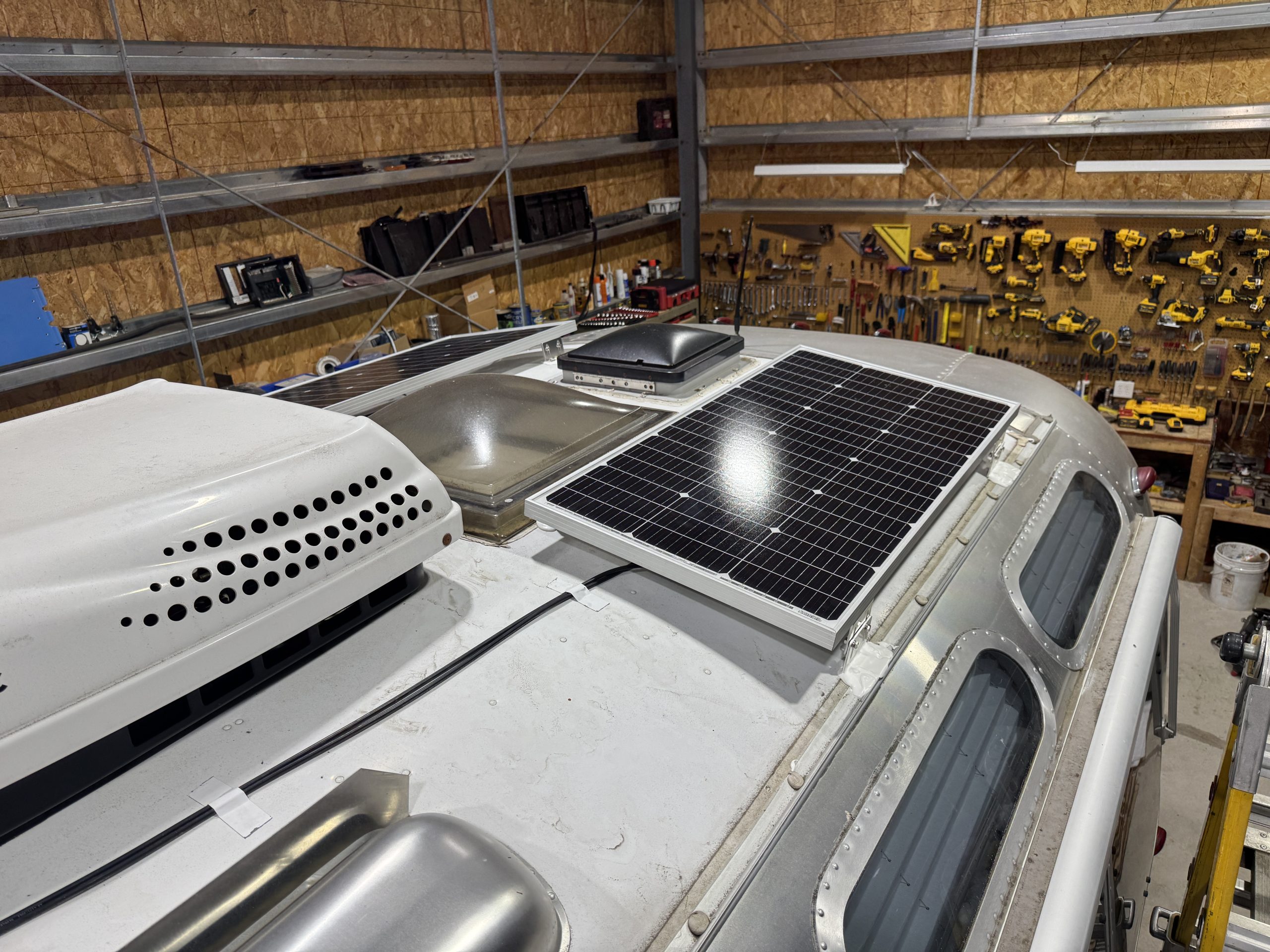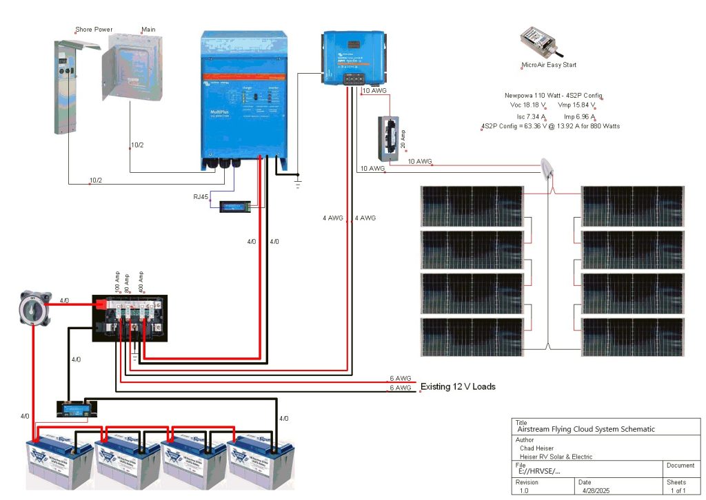 This installation was completed in May of 2025. The owner of this Airstream contacted me regarding a possible installation and we had discussions about various options. I presented the customer with estimates and system schematics for those options. The customer selected the option he preferred and we set an installation date. The installation took three days to complete. Initially, we discussed installing the system in the front exterior storage compartment, but after receiving the trailer for installation I found the passenger side exterior storage compartment and one small interior storage compartment would work better for the installation. These two compartments combined were slightly smaller in size than the front compartment, so less overall storage space was lost with the installation. The customer did gain the OEM battery box as a new exterior storage space as well. The new installation location put the inverter closer to the AC distribution panel and made wire runs easier to manage. The batteries fit perfectly in the side storage compartment and the inverter fit perfectly in the small interior storage compartment. I cut some holes in the side and back of the small interior storage compartment to allow for air flow around the inverter. I also built a platform under the inverter to leave an air gap underneath it to help with air circulation. In extreme use conditions, the door to this compartment has quick release hinges and can easily be removed for additional air flow around the inverter. Airstream trailers are always tight on space when it comes to adding a solar system and I try to minimize the amount of storage space lost when I complete an installation. This trailer had pre-run 10 AWG wire from the roof down to a dead space next to the side storage compartment where I mounted the batteries. This dead space was also where the OEM 12 volt distribution box was located. There was enough room in this dead space for me to mount the MPPT as well. This kept all the equipment within a few feet of each other and kept all the wire runs short. I changed out the OEM solar combiner box on the roof because it used proprietary connections rather than the standard MC4 connectors I needed for the solar panels. In order to make room for all the solar panels on the roof, I also removed the OEM over the air TV antenna (which the customer said he never used). With the antenna removed, there was just enough room to install eight 110 watt Newpowa solar panels. It was a tight fit on the roof though. The panels were installed with screws and Dicor sealant. I had discussions with the customer about using VHB tape to mount the panels initially. Once I test fit the panels though, all of the outside Z-brackets overlapped existing lap sealant seams and made using the VHB tape mounting method impossible. The customer was not opposed to using mechanical fasteners on the roof, so that was what I did instead. All of the equipment (other than the solar panels) was completely hidden from view with the installation, but was easily accessible for any future service needs.