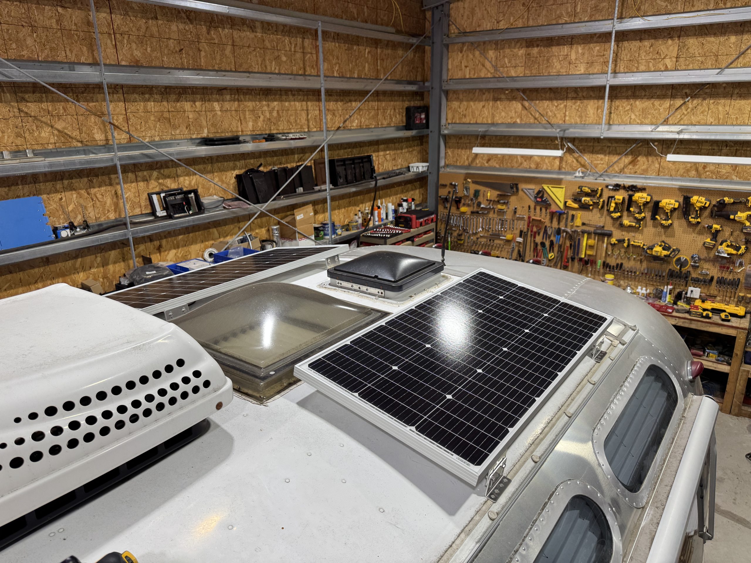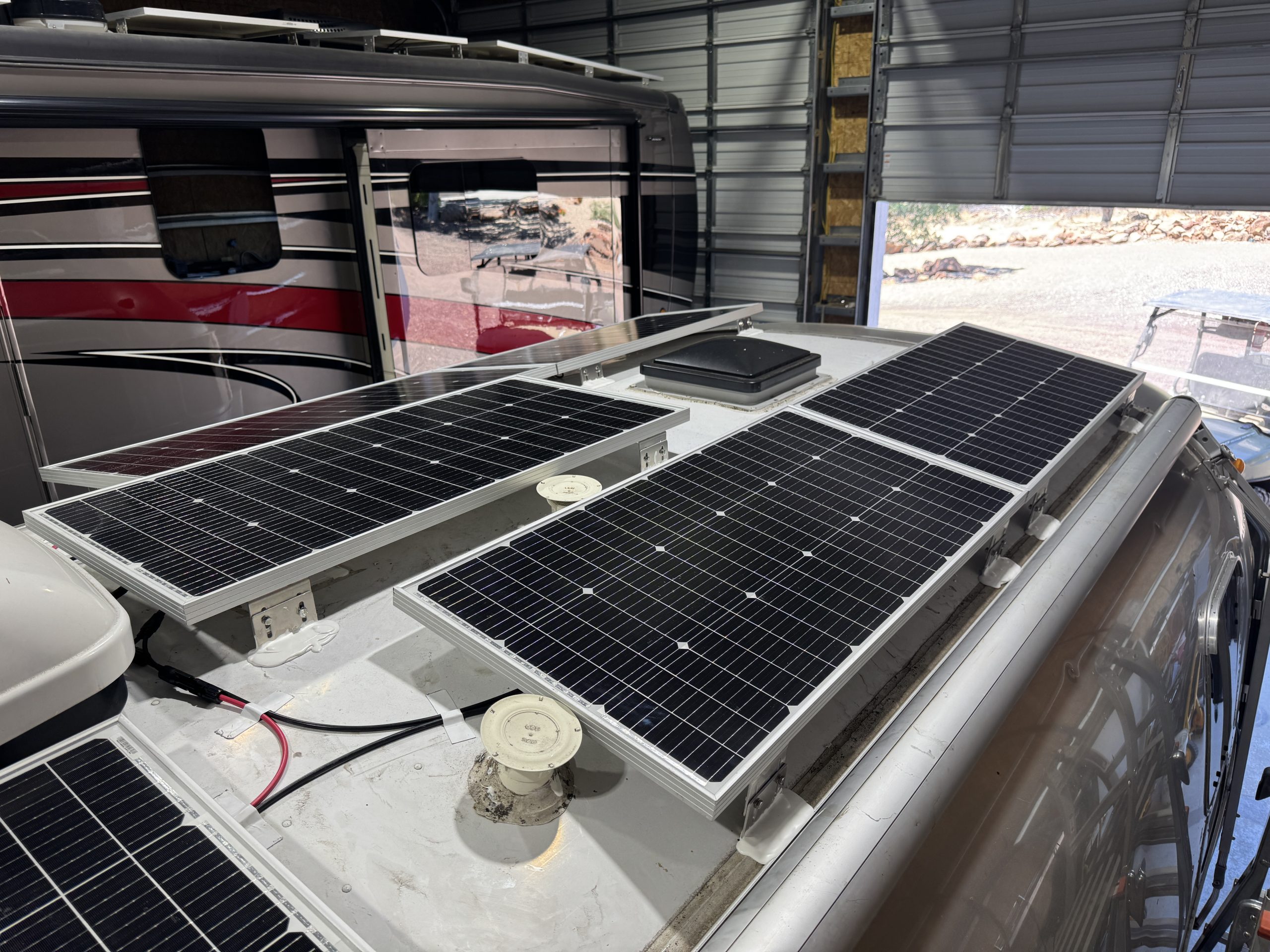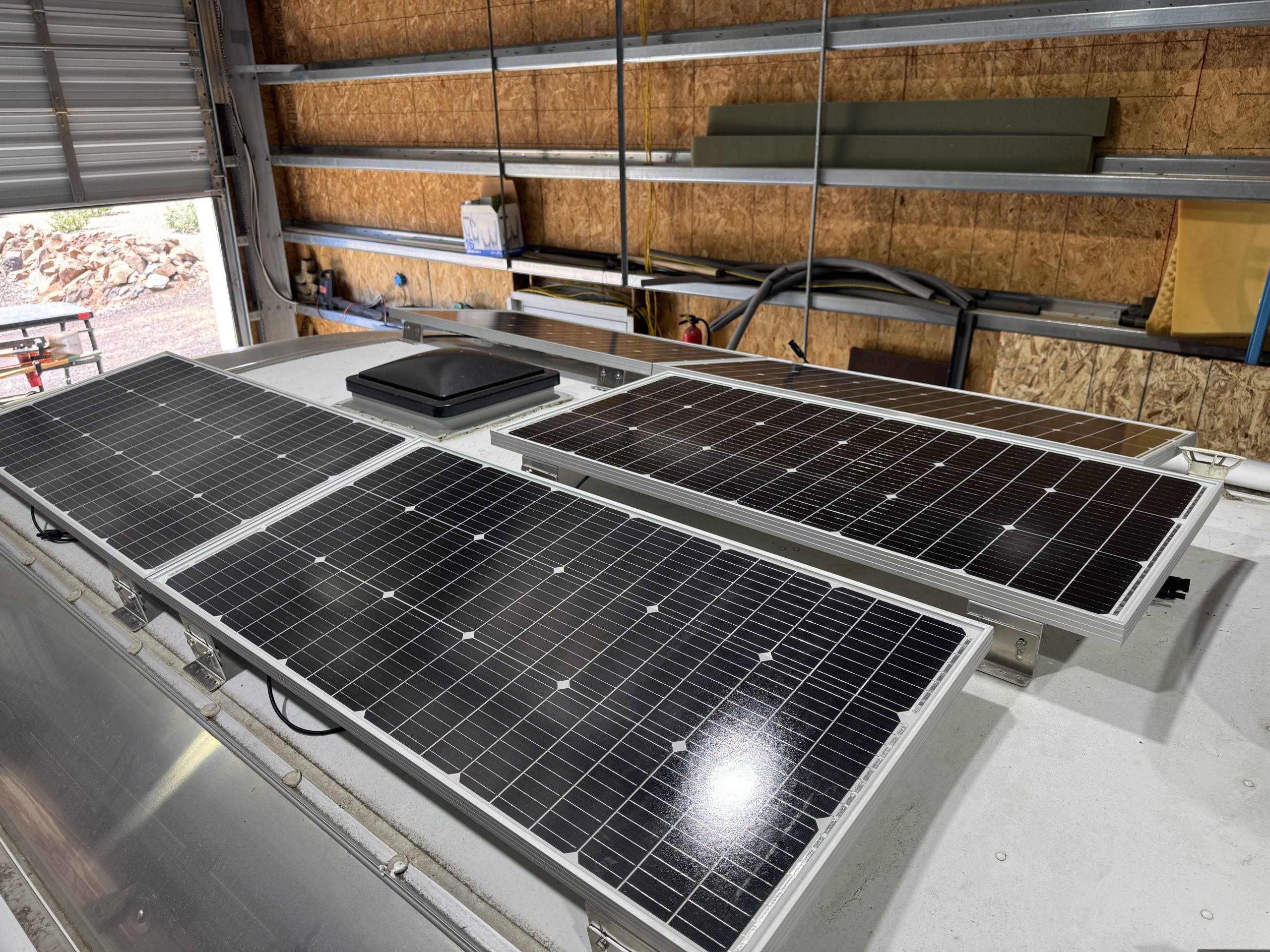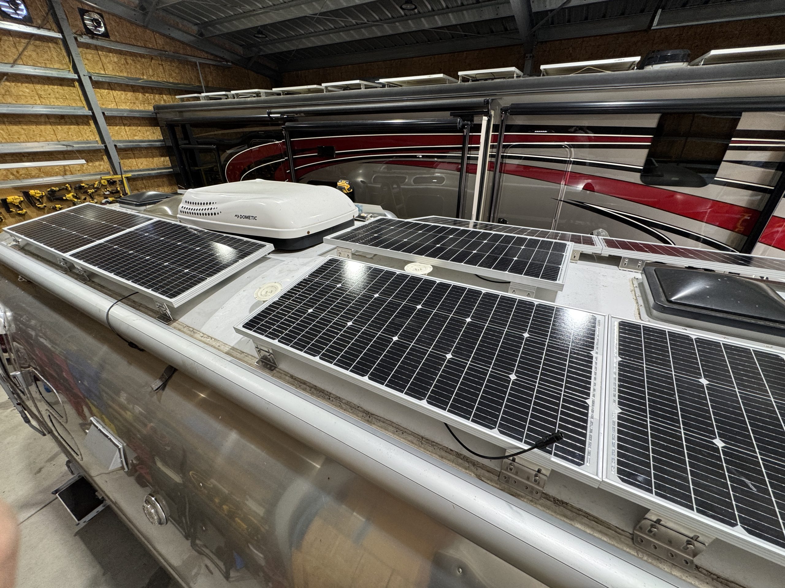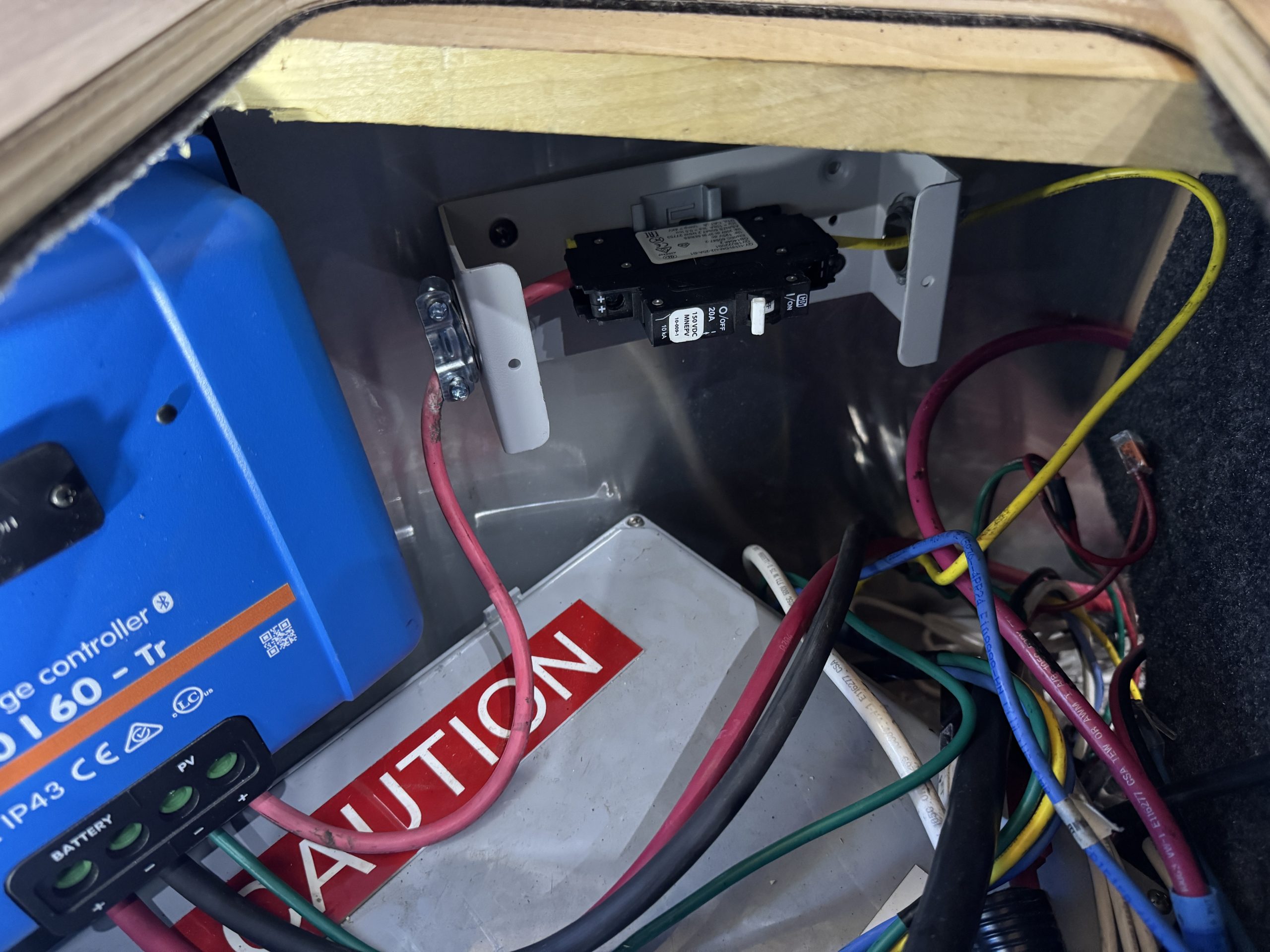 This installation was completed in May of 2025. The owner of this Airstream contacted me regarding a possible installation and we had discussions about various options. I presented the customer with estimates and system schematics for those options. The customer selected the option he preferred and we set an installation date. The installation took three days to complete. Initially, we discussed installing the system in the front exterior storage compartment, but after receiving the trailer for installation I found the passenger side exterior storage compartment and one small interior storage compartment would work better for the installation. These two compartments combined were slightly smaller in size than the front compartment, so less overall storage space was lost with the installation. The customer did gain the OEM battery box as a new exterior storage space as well. The new installation location put the inverter closer to the AC distribution panel and made wire runs easier to manage. The batteries fit perfectly in the side storage compartment and the inverter fit perfectly in the small interior storage compartment. I cut some holes in the side and back of the small interior storage compartment to allow for air flow around the inverter. I also built a platform under the inverter to leave an air gap underneath it to help with air circulation. In extreme use conditions, the door to this compartment has quick release hinges and can easily be removed for additional air flow around the inverter. Airstream trailers are always tight on space when it comes to adding a solar system and I try to minimize the amount of storage space lost when I complete an installation. This trailer had pre-run 10 AWG wire from the roof down to a dead space next to the side storage compartment where I mounted the batteries. This dead space was also where the OEM 12 volt distribution box was located. There was enough room in this dead space for me to mount the MPPT as well. This kept all the equipment within a few feet of each other and kept all the wire runs short. I changed out the OEM solar combiner box on the roof because it used proprietary connections rather than the standard MC4 connectors I needed for the solar panels. In order to make room for all the solar panels on the roof, I also removed the OEM over the air TV antenna (which the customer said he never used). With the antenna removed, there was just enough room to install eight 110 watt Newpowa solar panels. It was a tight fit on the roof though. The panels were installed with screws and Dicor sealant. I had discussions with the customer about using VHB tape to mount the panels initially. Once I test fit the panels though, all of the outside Z-brackets overlapped existing lap sealant seams and made using the VHB tape mounting method impossible. The customer was not opposed to using mechanical fasteners on the roof, so that was what I did instead. All of the equipment (other than the solar panels) was completely hidden from view with the installation, but was easily accessible for any future service needs.