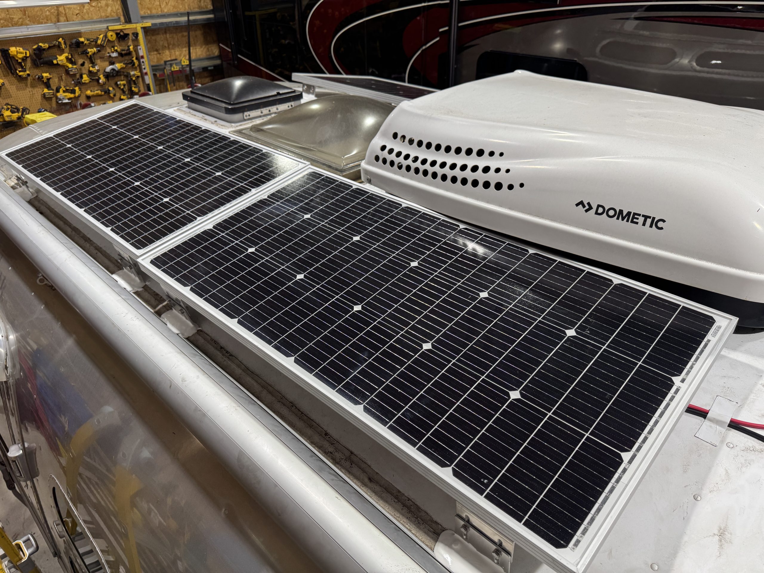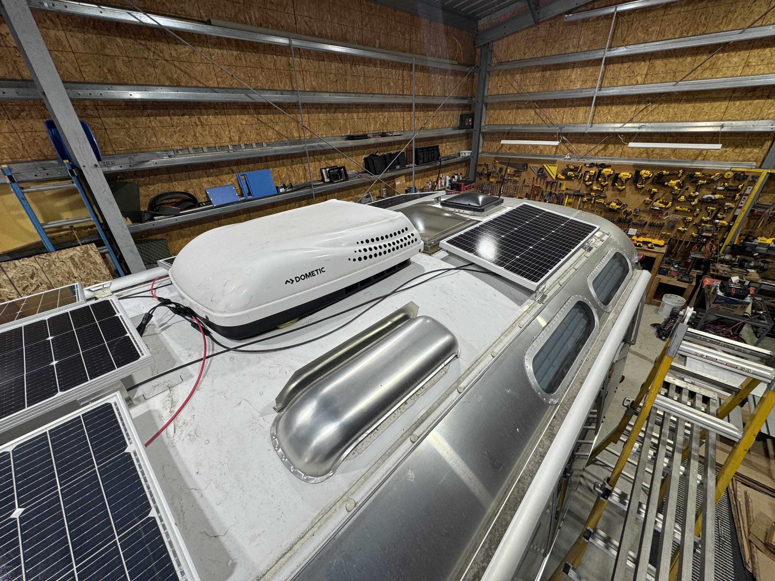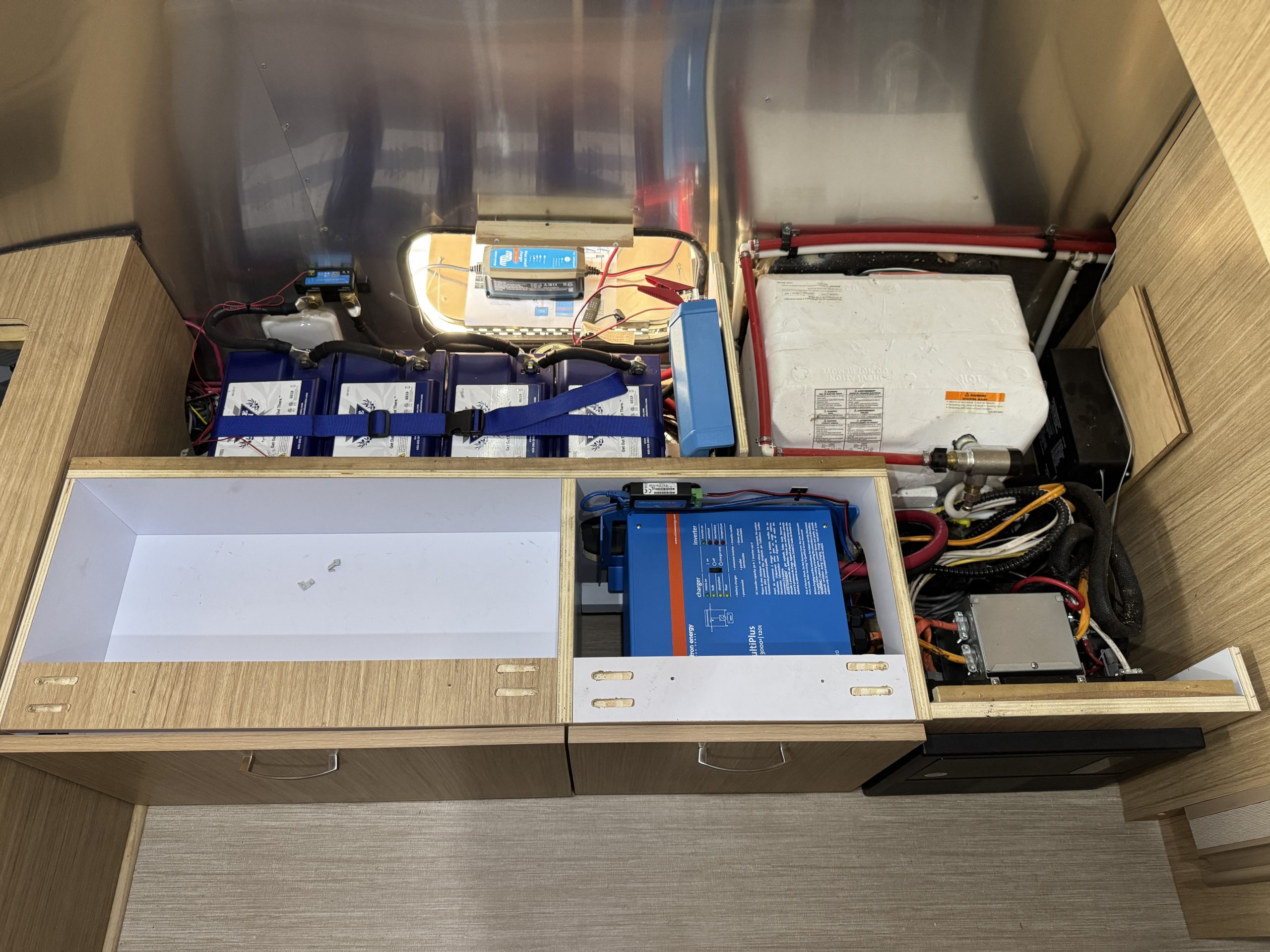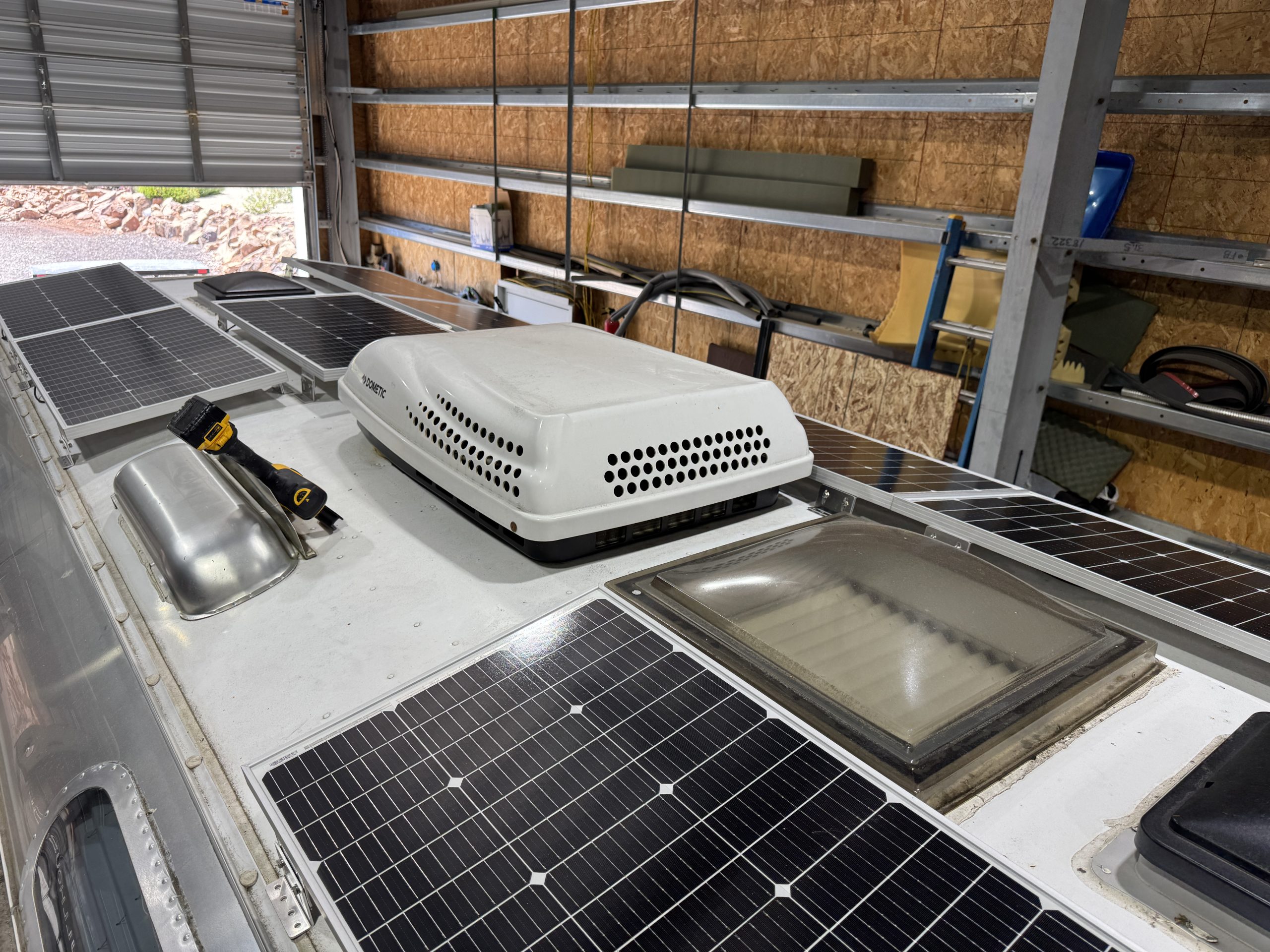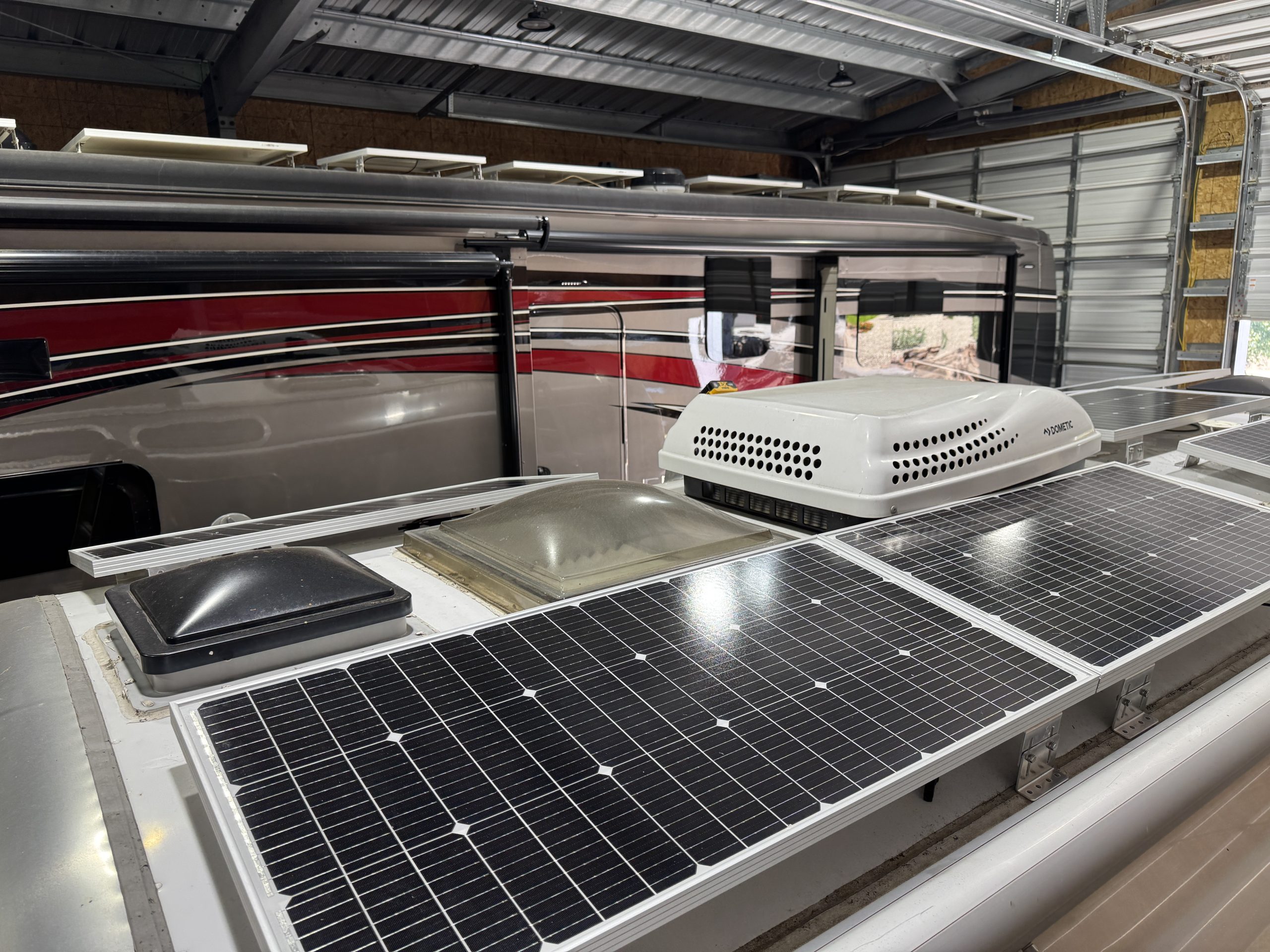 This installation was completed in May of 2025. The owner of this Airstream contacted me regarding a possible installation and we had discussions about various options. I presented the customer with estimates and system schematics for those options. The customer selected the option he preferred and we set an installation date. The installation took three days to complete. Initially, we discussed installing the system in the front exterior storage compartment, but after receiving the trailer for installation I found the passenger side exterior storage compartment and one small interior storage compartment would work better for the installation. These two compartments combined were slightly smaller in size than the front compartment, so less overall storage space was lost with the installation. The customer did gain the OEM battery box as a new exterior storage space as well. The new installation location put the inverter closer to the AC distribution panel and made wire runs easier to manage. The batteries fit perfectly in the side storage compartment and the inverter fit perfectly in the small interior storage compartment. I cut some holes in the side and back of the small interior storage compartment to allow for air flow around the inverter. I also built a platform under the inverter to leave an air gap underneath it to help with air circulation. In extreme use conditions, the door to this compartment has quick release hinges and can easily be removed for additional air flow around the inverter. Airstream trailers are always tight on space when it comes to adding a solar system and I try to minimize the amount of storage space lost when I complete an installation. This trailer had pre-run 10 AWG wire from the roof down to a dead space next to the side storage compartment where I mounted the batteries. This dead space was also where the OEM 12 volt distribution box was located. There was enough room in this dead space for me to mount the MPPT as well. This kept all the equipment within a few feet of each other and kept all the wire runs short. I changed out the OEM solar combiner box on the roof because it used proprietary connections rather than the standard MC4 connectors I needed for the solar panels. In order to make room for all the solar panels on the roof, I also removed the OEM over the air TV antenna (which the customer said he never used). With the antenna removed, there was just enough room to install eight 110 watt Newpowa solar panels. It was a tight fit on the roof though. The panels were installed with screws and Dicor sealant. I had discussions with the customer about using VHB tape to mount the panels initially. Once I test fit the panels though, all of the outside Z-brackets overlapped existing lap sealant seams and made using the VHB tape mounting method impossible. The customer was not opposed to using mechanical fasteners on the roof, so that was what I did instead. All of the equipment (other than the solar panels) was completely hidden from view with the installation, but was easily accessible for any future service needs.
