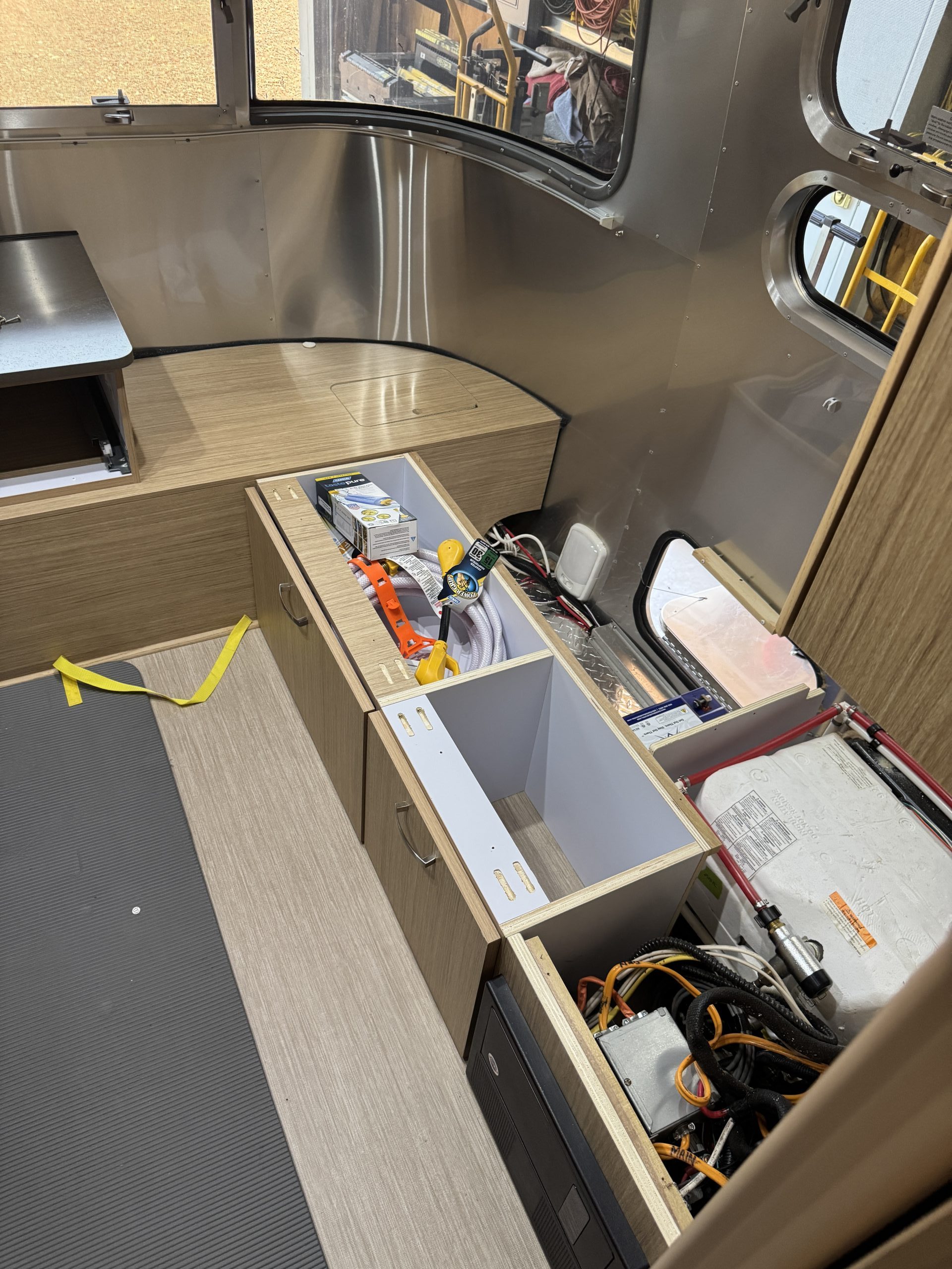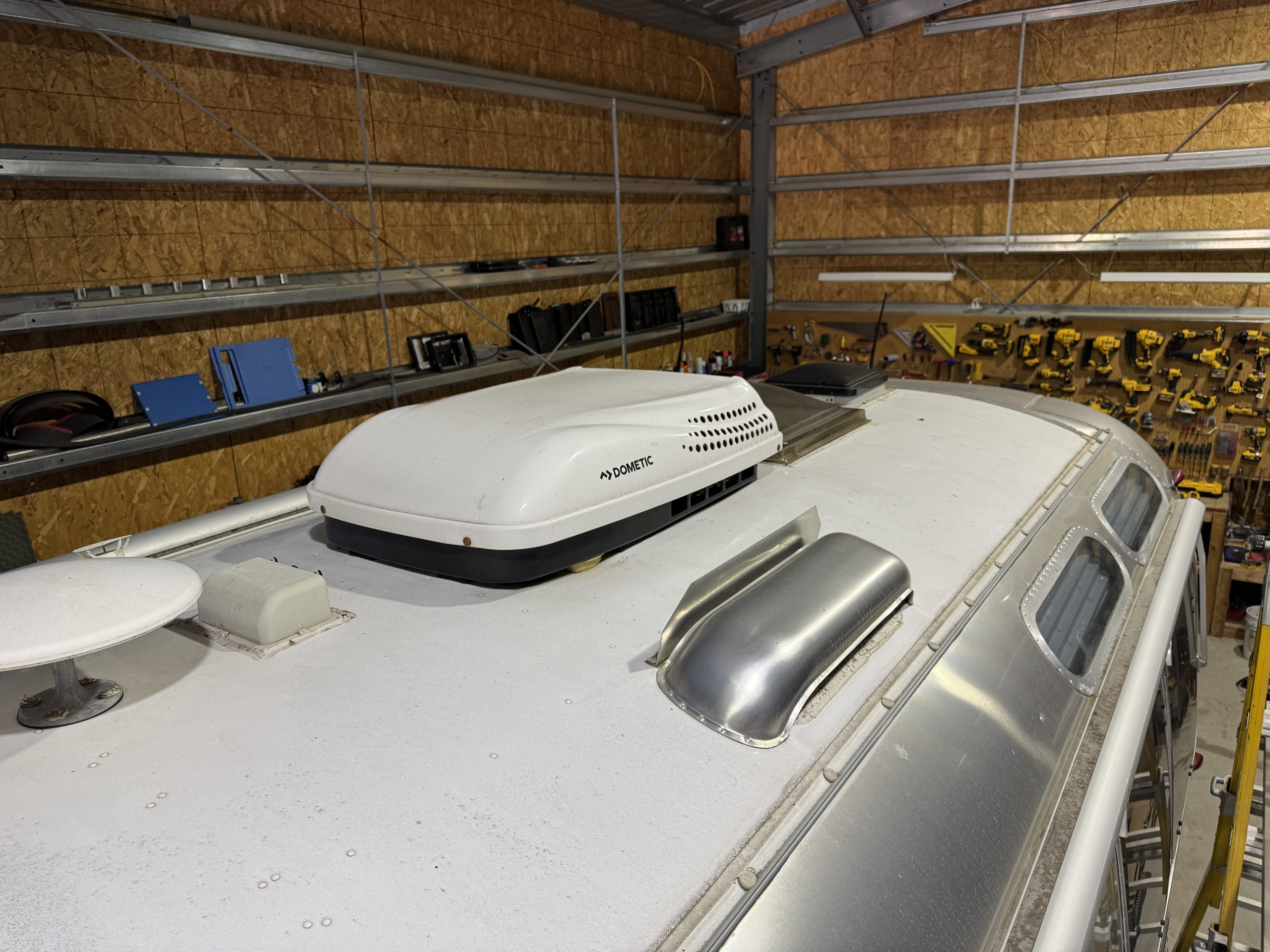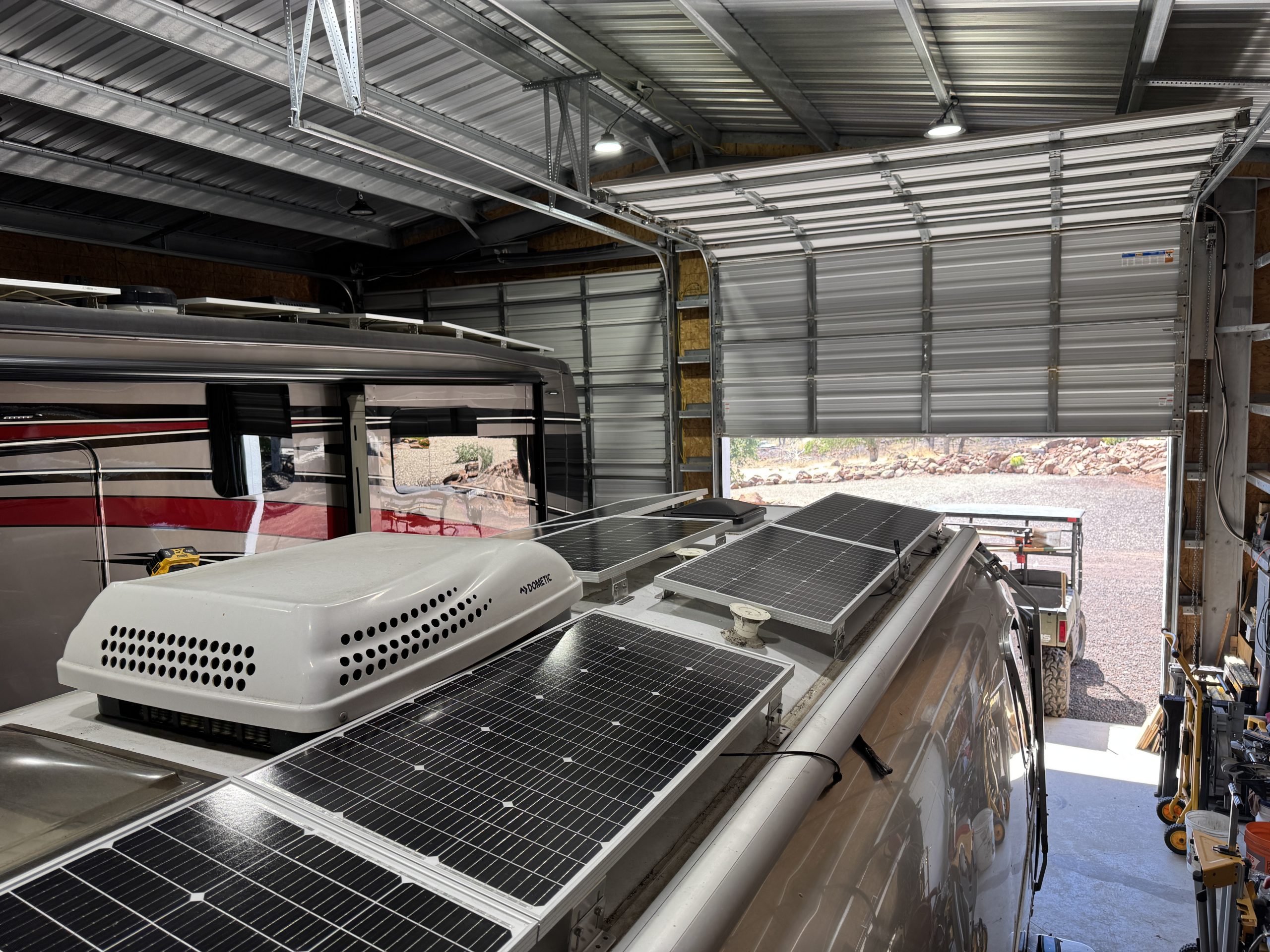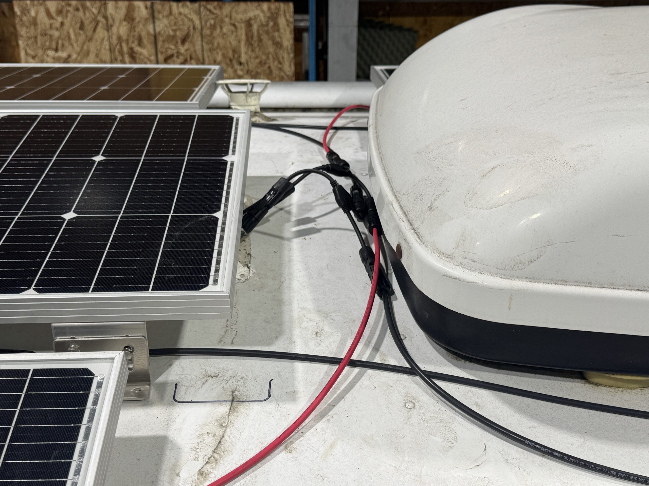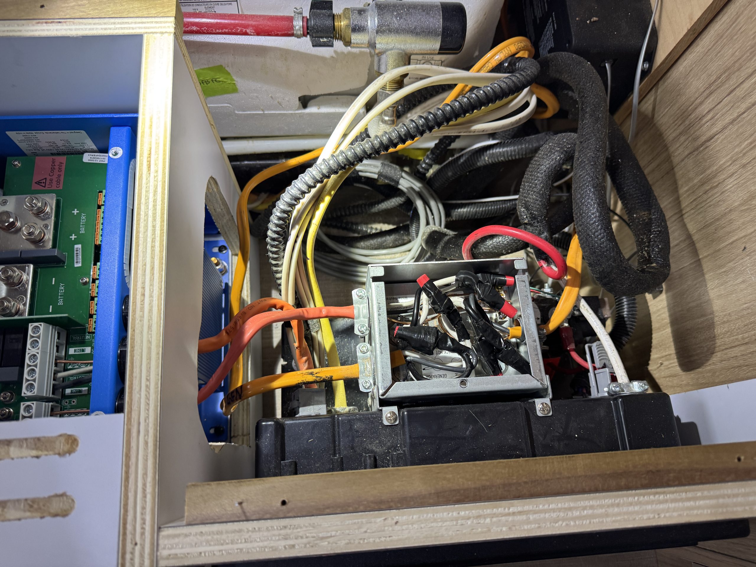 This installation was completed in May of 2025. The owner of this Airstream contacted me regarding a possible installation and we had discussions about various options. I presented the customer with estimates and system schematics for those options. The customer selected the option he preferred and we set an installation date. The installation took three days to complete. Initially, we discussed installing the system in the front exterior storage compartment, but after receiving the trailer for installation I found the passenger side exterior storage compartment and one small interior storage compartment would work better for the installation. These two compartments combined were slightly smaller in size than the front compartment, so less overall storage space was lost with the installation. The customer did gain the OEM battery box as a new exterior storage space as well. The new installation location put the inverter closer to the AC distribution panel and made wire runs easier to manage. The batteries fit perfectly in the side storage compartment and the inverter fit perfectly in the small interior storage compartment. I cut some holes in the side and back of the small interior storage compartment to allow for air flow around the inverter. I also built a platform under the inverter to leave an air gap underneath it to help with air circulation. In extreme use conditions, the door to this compartment has quick release hinges and can easily be removed for additional air flow around the inverter. Airstream trailers are always tight on space when it comes to adding a solar system and I try to minimize the amount of storage space lost when I complete an installation. This trailer had pre-run 10 AWG wire from the roof down to a dead space next to the side storage compartment where I mounted the batteries. This dead space was also where the OEM 12 volt distribution box was located. There was enough room in this dead space for me to mount the MPPT as well. This kept all the equipment within a few feet of each other and kept all the wire runs short. I changed out the OEM solar combiner box on the roof because it used proprietary connections rather than the standard MC4 connectors I needed for the solar panels. In order to make room for all the solar panels on the roof, I also removed the OEM over the air TV antenna (which the customer said he never used). With the antenna removed, there was just enough room to install eight 110 watt Newpowa solar panels. It was a tight fit on the roof though. The panels were installed with screws and Dicor sealant. I had discussions with the customer about using VHB tape to mount the panels initially. Once I test fit the panels though, all of the outside Z-brackets overlapped existing lap sealant seams and made using the VHB tape mounting method impossible. The customer was not opposed to using mechanical fasteners on the roof, so that was what I did instead. All of the equipment (other than the solar panels) was completely hidden from view with the installation, but was easily accessible for any future service needs.