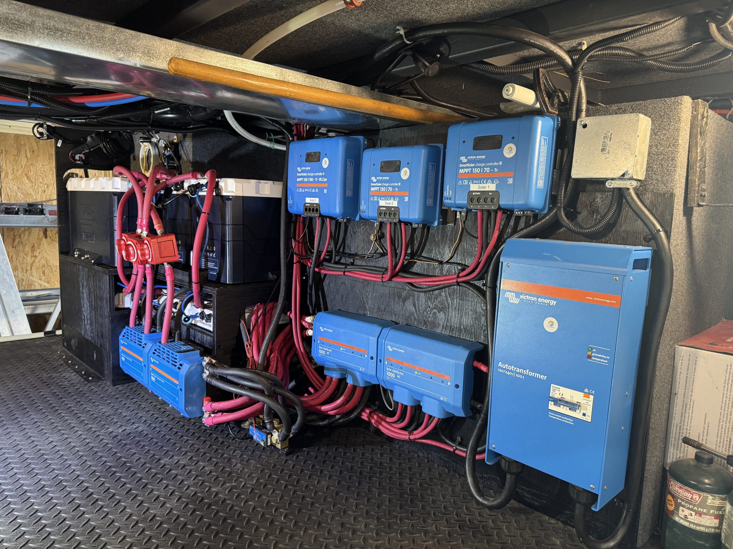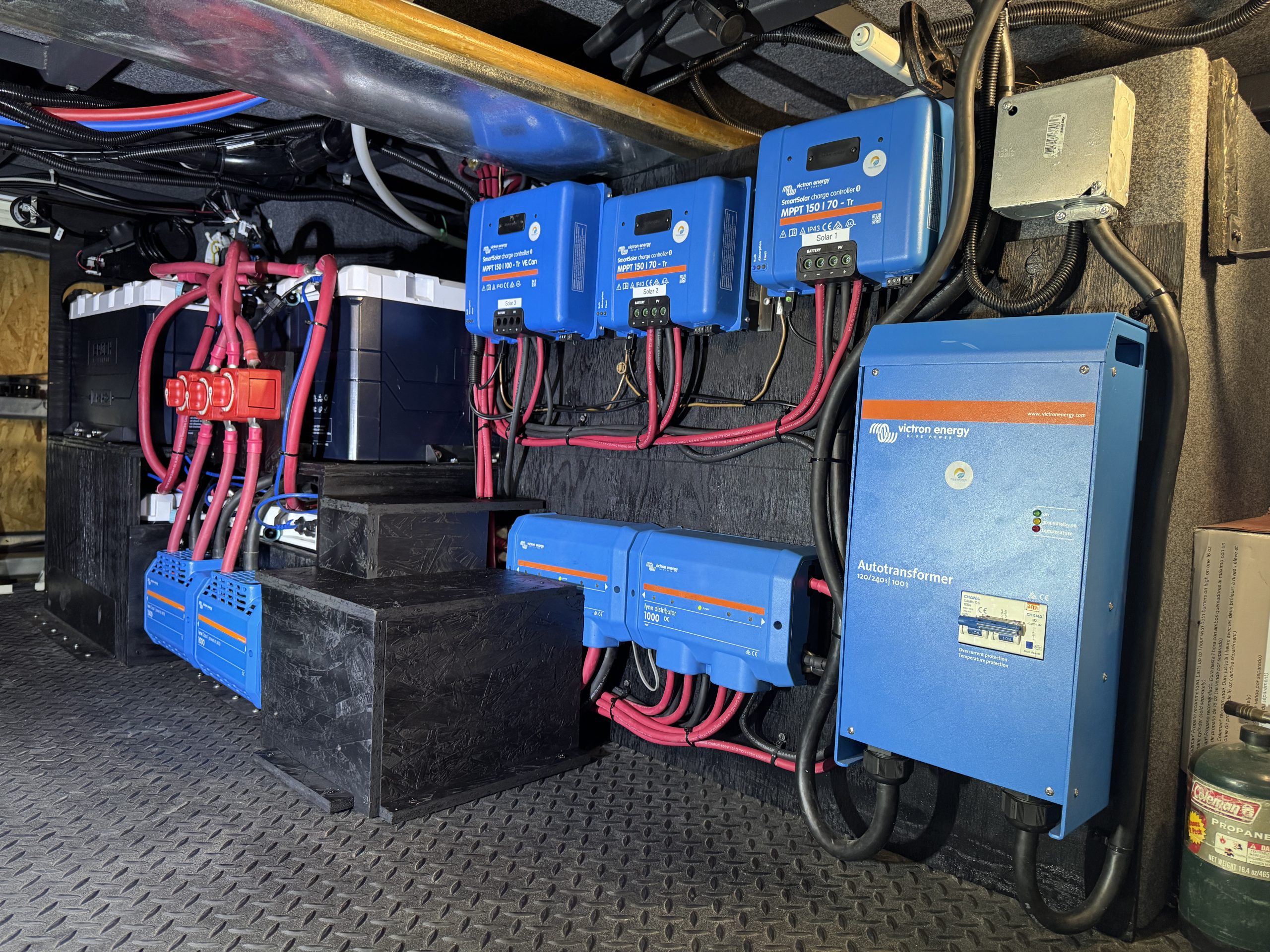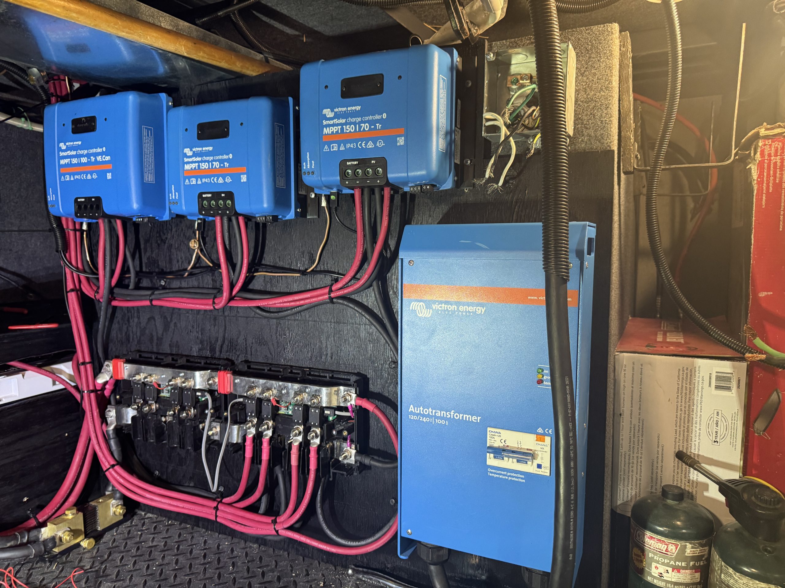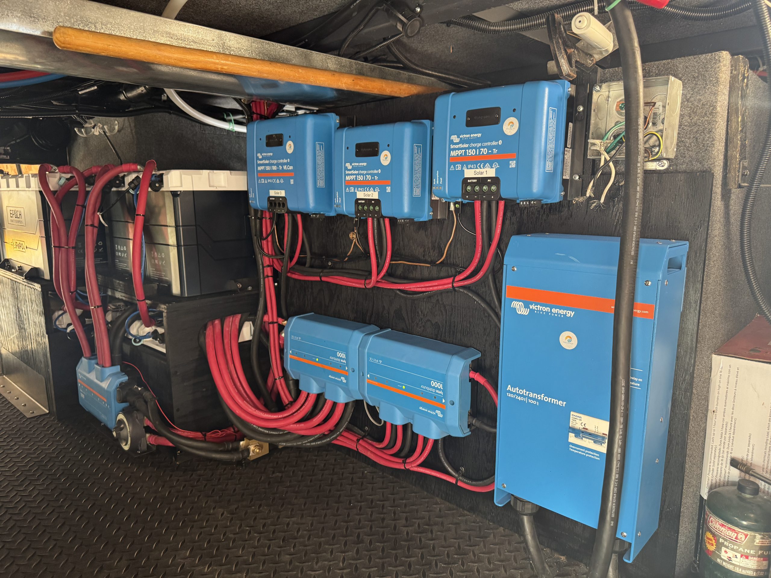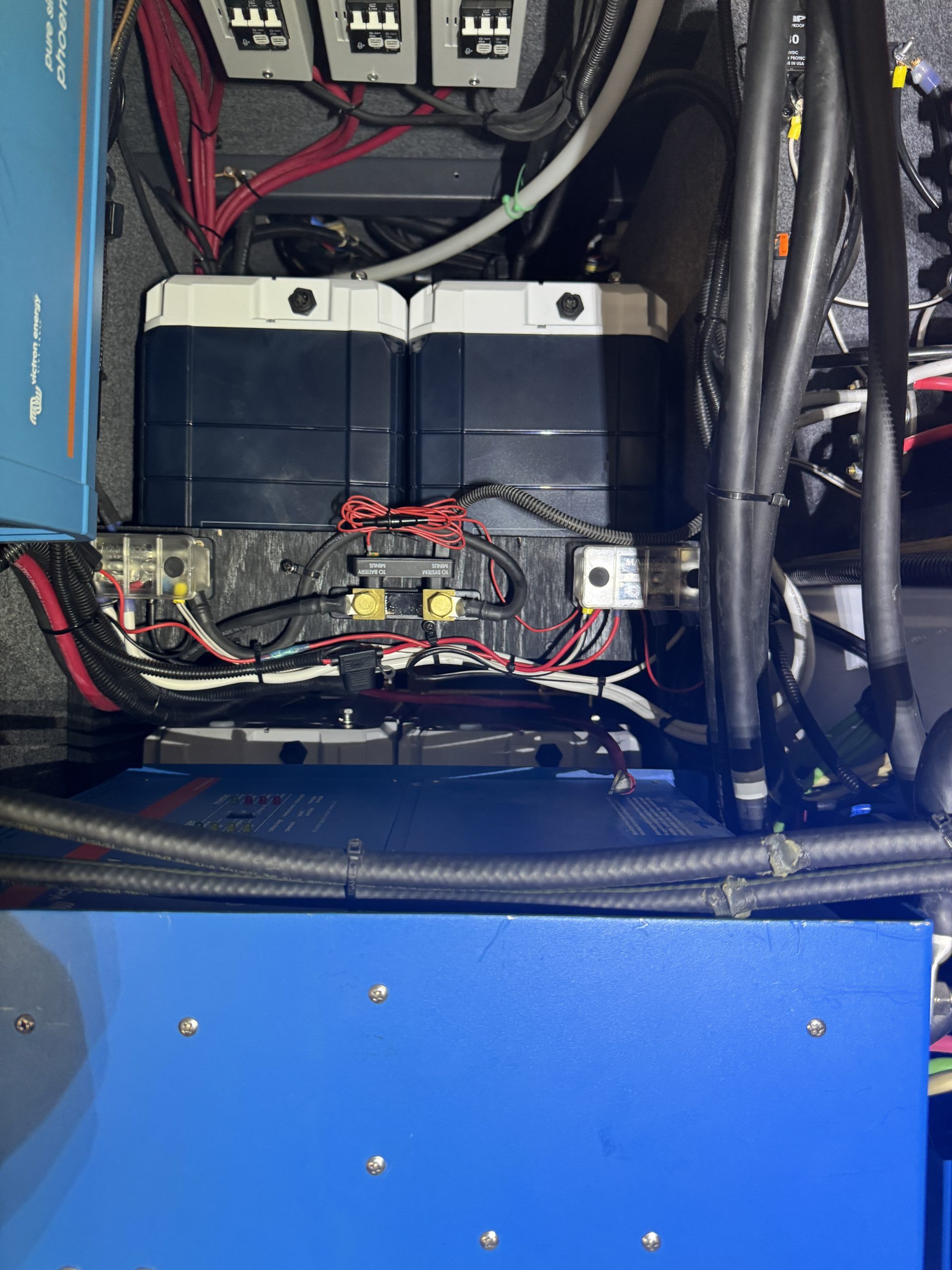 The EPOCH Elite Series batteries require a little more work than most batteries to install properly.  This includes individual firmware updates, setting battery DIP switches for integrated communications and interconnecting all the batteries with communication cables.  The Master battery has a small, remote display attached to the main comms harness that I mounted in the bay with the batteries.  I had to extend the RJ45 cable on the same main comms harness that goes to the Victron GX device to reach the location where I had my Cerbo GX installed.  This was easy to do with a female to female RJ45 adapter and a second Ethernet cable.  I mounted my batteries in stacked pairs.  Unfortunately the interconnect communication cables that come with the batteries weren’t long enough to reach a battery stacked on top of another battery (the cables are designed for side by side installation and reach that configuration perfectly).  As a result, I had to use a couple of standard Victron RJ45 communication cables to reach the longer distance.  This resulted in not having waterproof connectors for those connections (like the factory EPOCH cables have), but this was not a concern for my installation inside a storage compartment in my RV.  I also had to contend with the fact EPOCH batteries have a sophisticated BMS installed to monitor and manage all the features of the Elite series batteries.  When I initially connected the batteries to the rest of the system, the batteries would immediately shut down.  I determined this was because the large capacity capacitors in my dual Quattro 5KVA inverter chargers were drained from lack of DC power and the heavy inrush of DC current trying to fill those capacitors back up made the EPOCH battery BMSs think there was a dead short somewhere.  This resulted in the batteries shutting down to protect against the hazard they were detecting.  This necessitated multiple start up and shut down cycles to slowly charge the capacitors in the Quattros before the batteries would remain on and active.  This could have been avoided by pre-charging the Quattro capacitors, but I did not have the equipment needed to accomplish this task readily available when I hooked the batteries up (I do now so I can avoid this issue in the future).