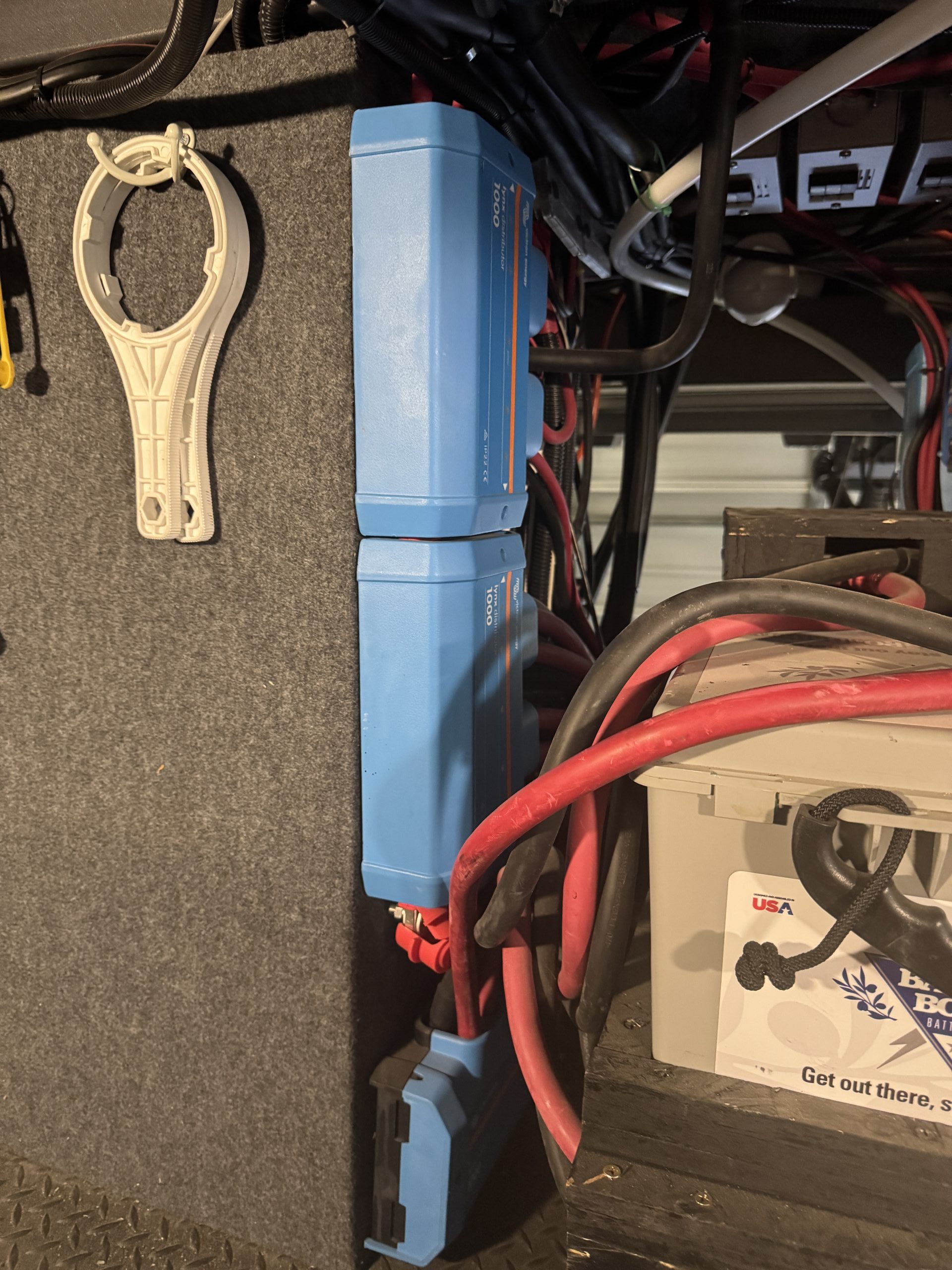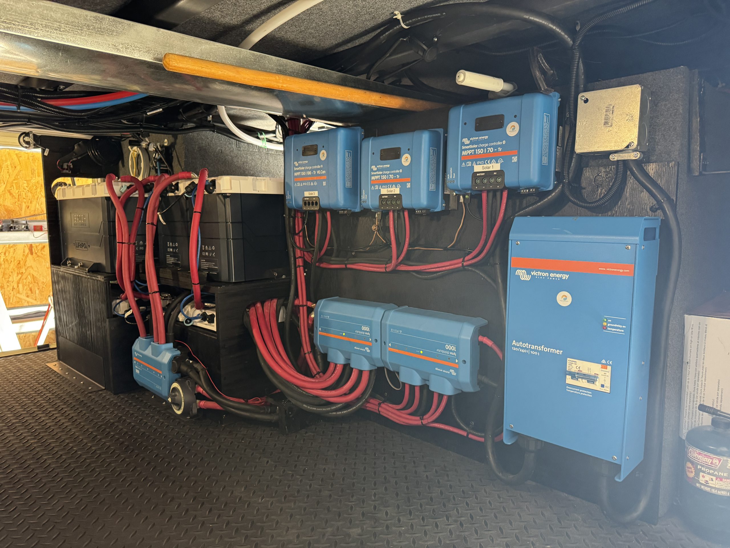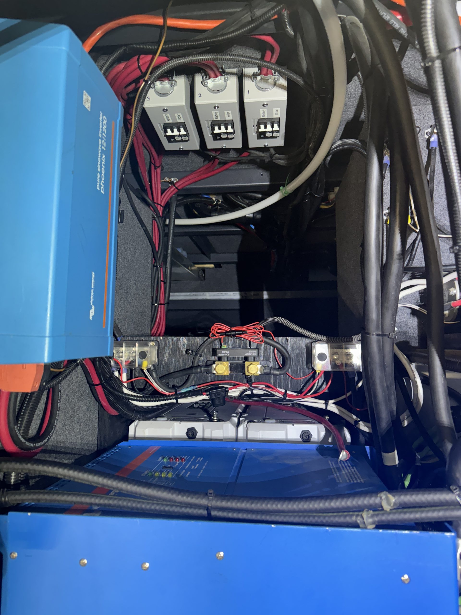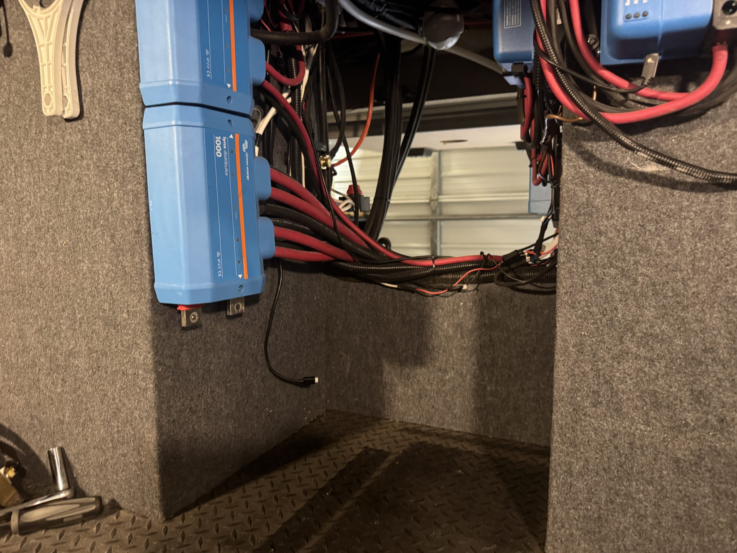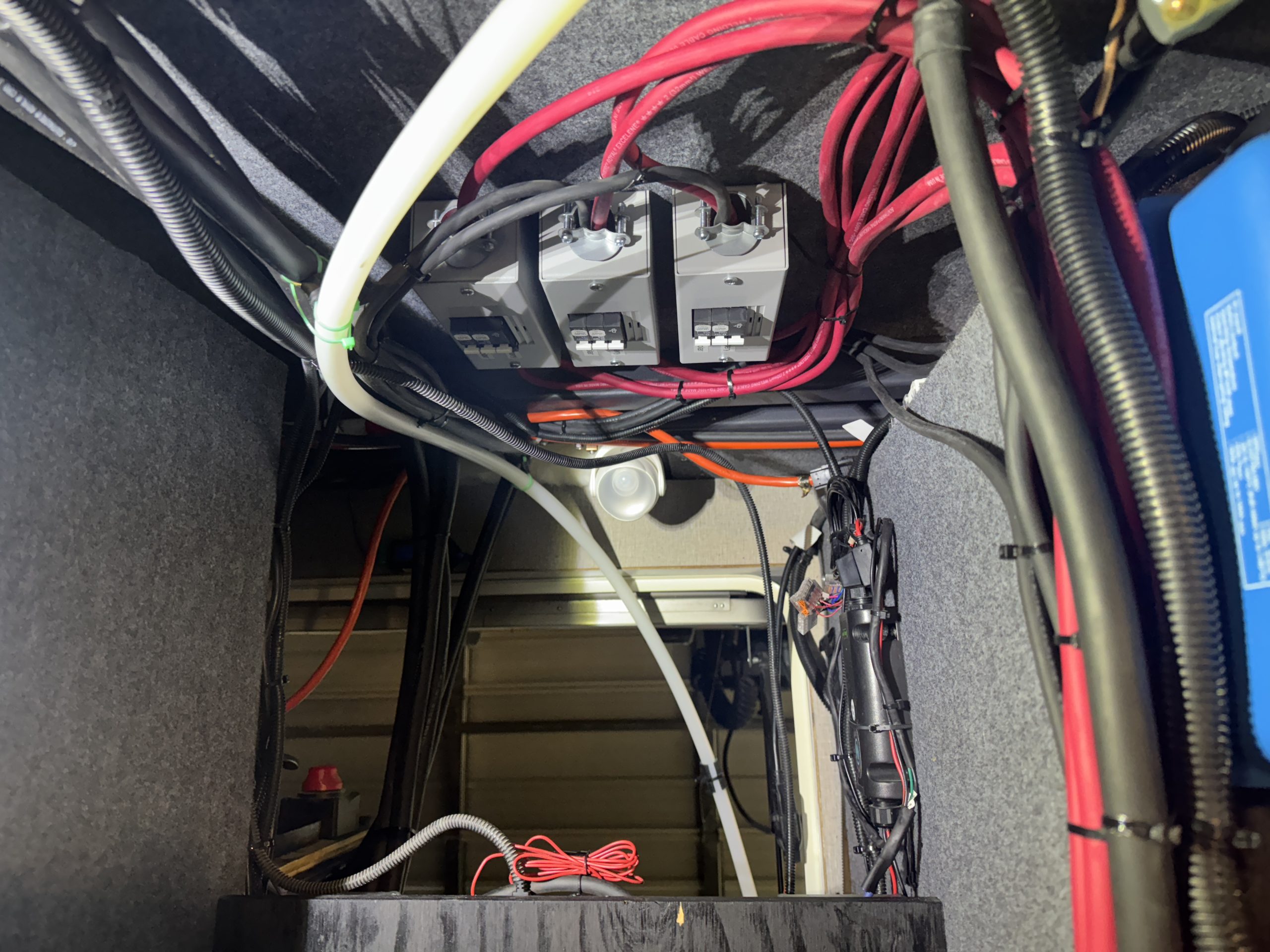 The EPOCH Elite Series batteries require a little more work than most batteries to install properly.  This includes individual firmware updates, setting battery DIP switches for integrated communications and interconnecting all the batteries with communication cables.  The Master battery has a small, remote display attached to the main comms harness that I mounted in the bay with the batteries.  I had to extend the RJ45 cable on the same main comms harness that goes to the Victron GX device to reach the location where I had my Cerbo GX installed.  This was easy to do with a female to female RJ45 adapter and a second Ethernet cable.  I mounted my batteries in stacked pairs.  Unfortunately the interconnect communication cables that come with the batteries weren’t long enough to reach a battery stacked on top of another battery (the cables are designed for side by side installation and reach that configuration perfectly).  As a result, I had to use a couple of standard Victron RJ45 communication cables to reach the longer distance.  This resulted in not having waterproof connectors for those connections (like the factory EPOCH cables have), but this was not a concern for my installation inside a storage compartment in my RV.  I also had to contend with the fact EPOCH batteries have a sophisticated BMS installed to monitor and manage all the features of the Elite series batteries.  When I initially connected the batteries to the rest of the system, the batteries would immediately shut down.  I determined this was because the large capacity capacitors in my dual Quattro 5KVA inverter chargers were drained from lack of DC power and the heavy inrush of DC current trying to fill those capacitors back up made the EPOCH battery BMSs think there was a dead short somewhere.  This resulted in the batteries shutting down to protect against the hazard they were detecting.  This necessitated multiple start up and shut down cycles to slowly charge the capacitors in the Quattros before the batteries would remain on and active.  This could have been avoided by pre-charging the Quattro capacitors, but I did not have the equipment needed to accomplish this task readily available when I hooked the batteries up (I do now so I can avoid this issue in the future).