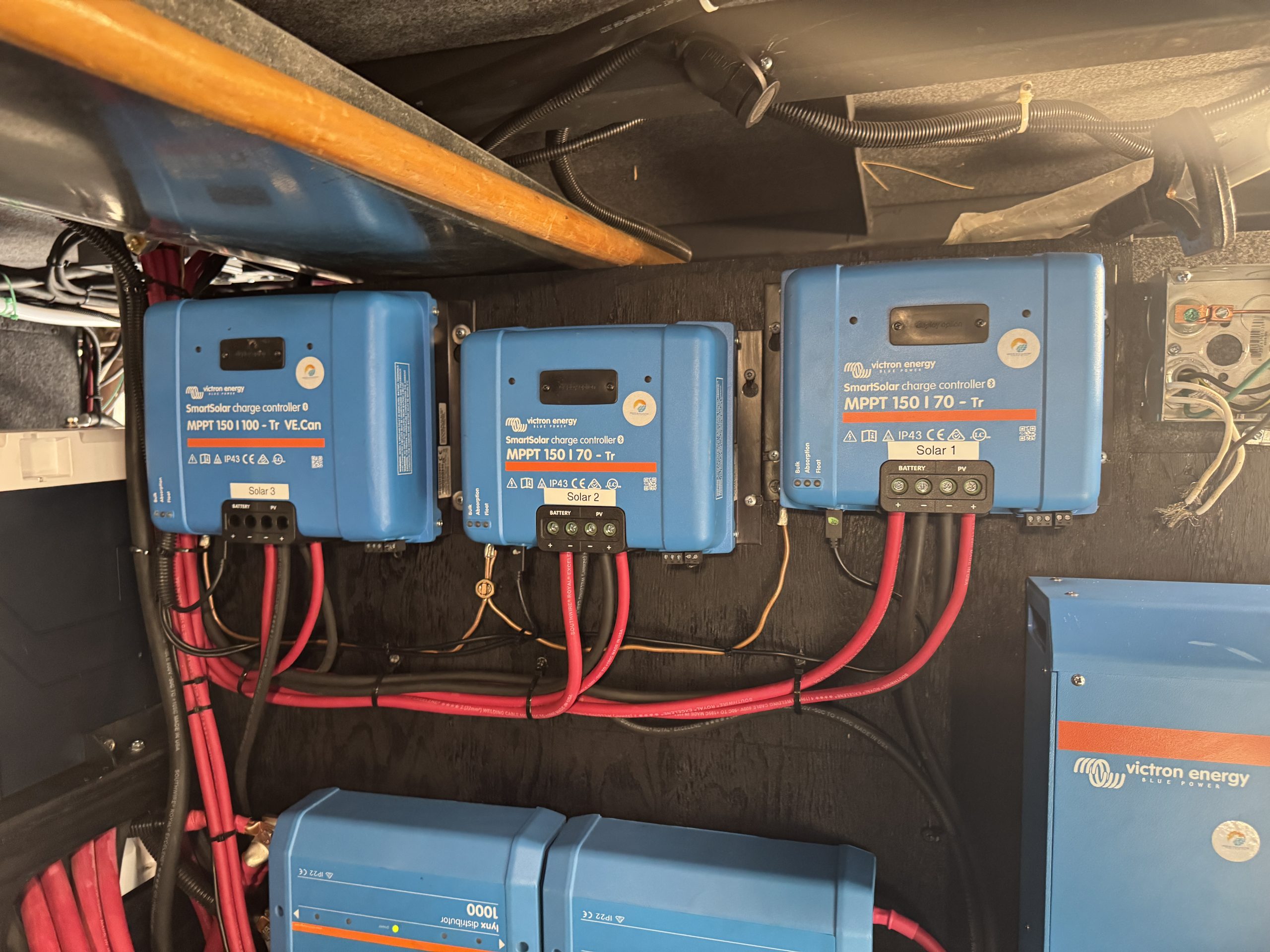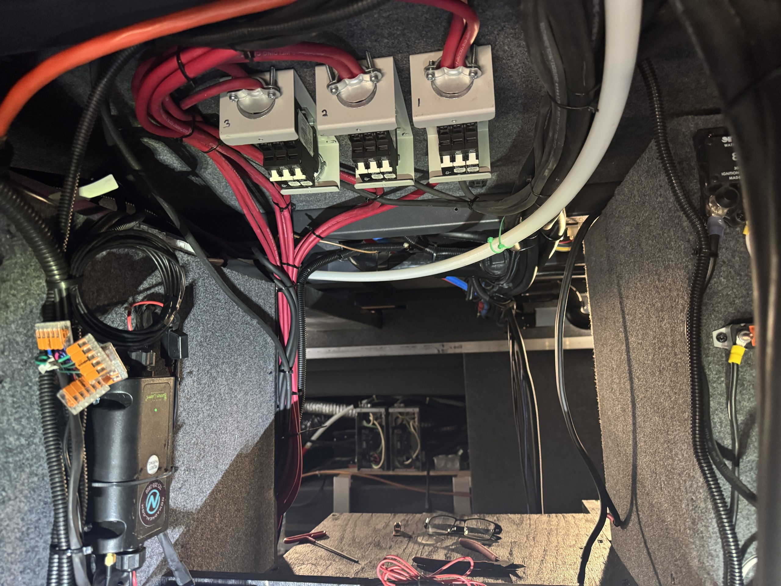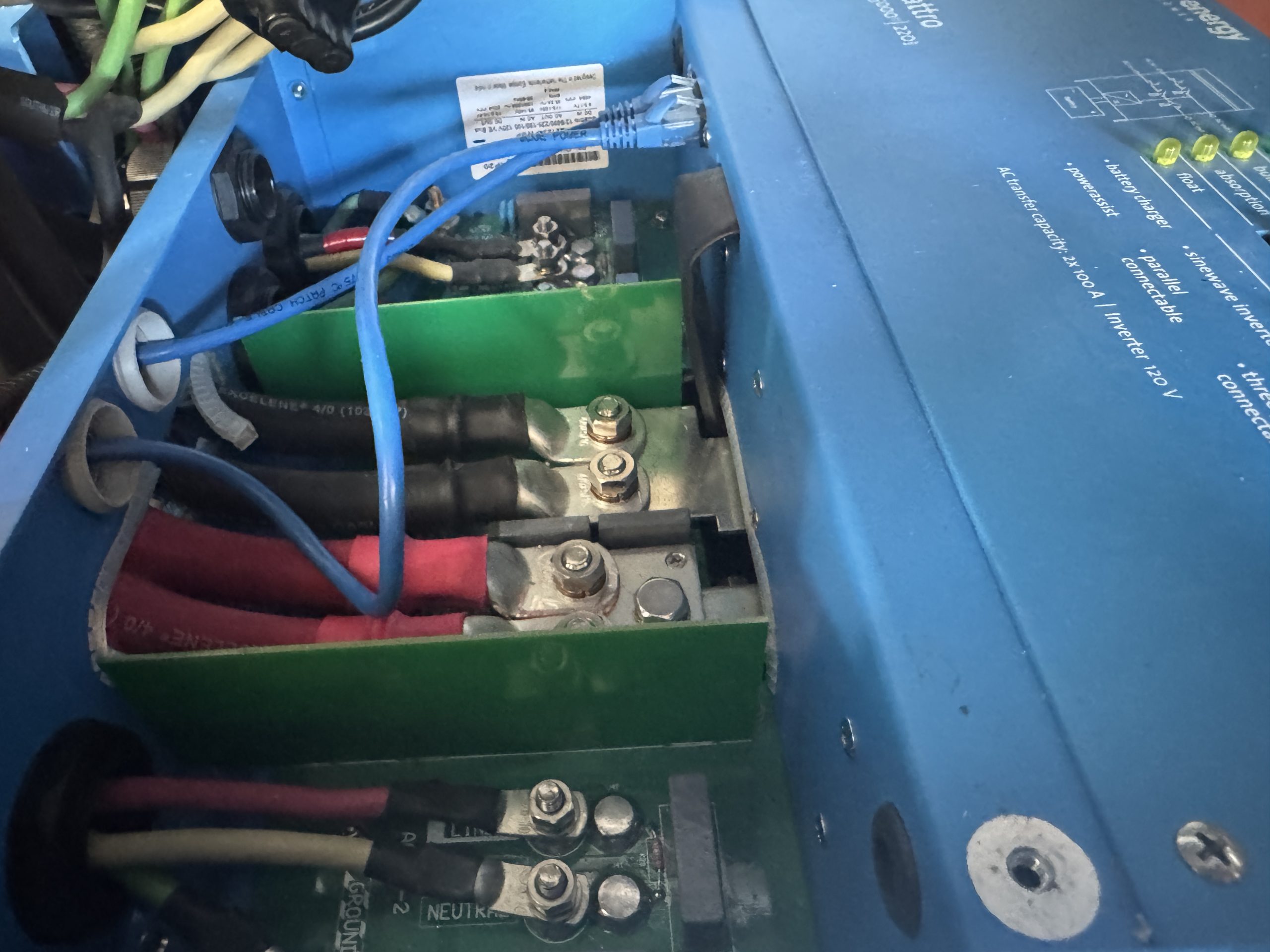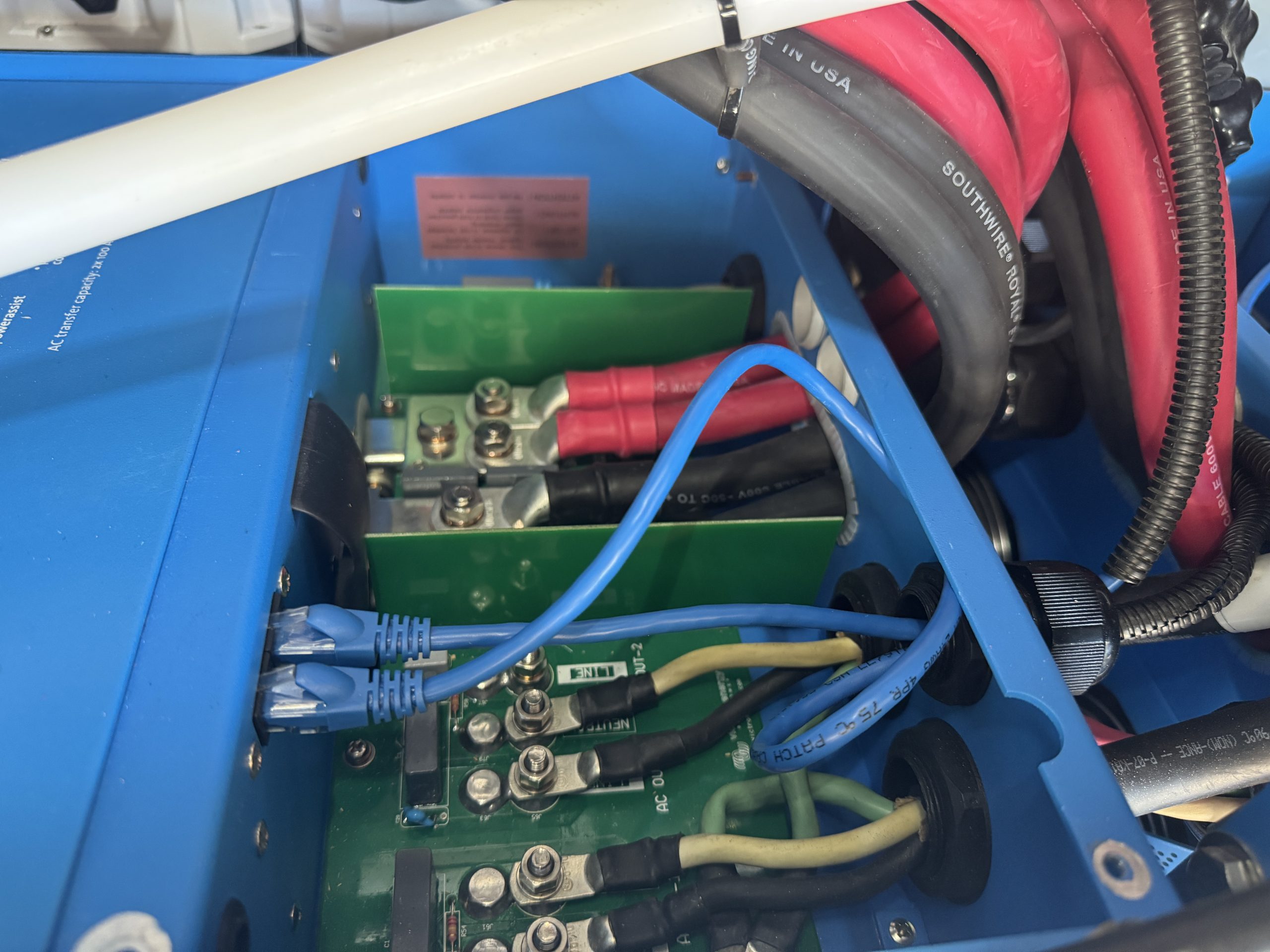 The EPOCH Elite Series batteries require a little more work than most batteries to install properly.  This includes individual firmware updates, setting battery DIP switches for integrated communications and interconnecting all the batteries with communication cables.  The Master battery has a small, remote display attached to the main comms harness that I mounted in the bay with the batteries.  I had to extend the RJ45 cable on the same main comms harness that goes to the Victron GX device to reach the location where I had my Cerbo GX installed.  This was easy to do with a female to female RJ45 adapter and a second Ethernet cable.  I mounted my batteries in stacked pairs.  Unfortunately the interconnect communication cables that come with the batteries weren’t long enough to reach a battery stacked on top of another battery (the cables are designed for side by side installation and reach that configuration perfectly).  As a result, I had to use a couple of standard Victron RJ45 communication cables to reach the longer distance.  This resulted in not having waterproof connectors for those connections (like the factory EPOCH cables have), but this was not a concern for my installation inside a storage compartment in my RV.  I also had to contend with the fact EPOCH batteries have a sophisticated BMS installed to monitor and manage all the features of the Elite series batteries.  When I initially connected the batteries to the rest of the system, the batteries would immediately shut down.  I determined this was because the large capacity capacitors in my dual Quattro 5KVA inverter chargers were drained from lack of DC power and the heavy inrush of DC current trying to fill those capacitors back up made the EPOCH battery BMSs think there was a dead short somewhere.  This resulted in the batteries shutting down to protect against the hazard they were detecting.  This necessitated multiple start up and shut down cycles to slowly charge the capacitors in the Quattros before the batteries would remain on and active.  This could have been avoided by pre-charging the Quattro capacitors, but I did not have the equipment needed to accomplish this task readily available when I hooked the batteries up (I do now so I can avoid this issue in the future).