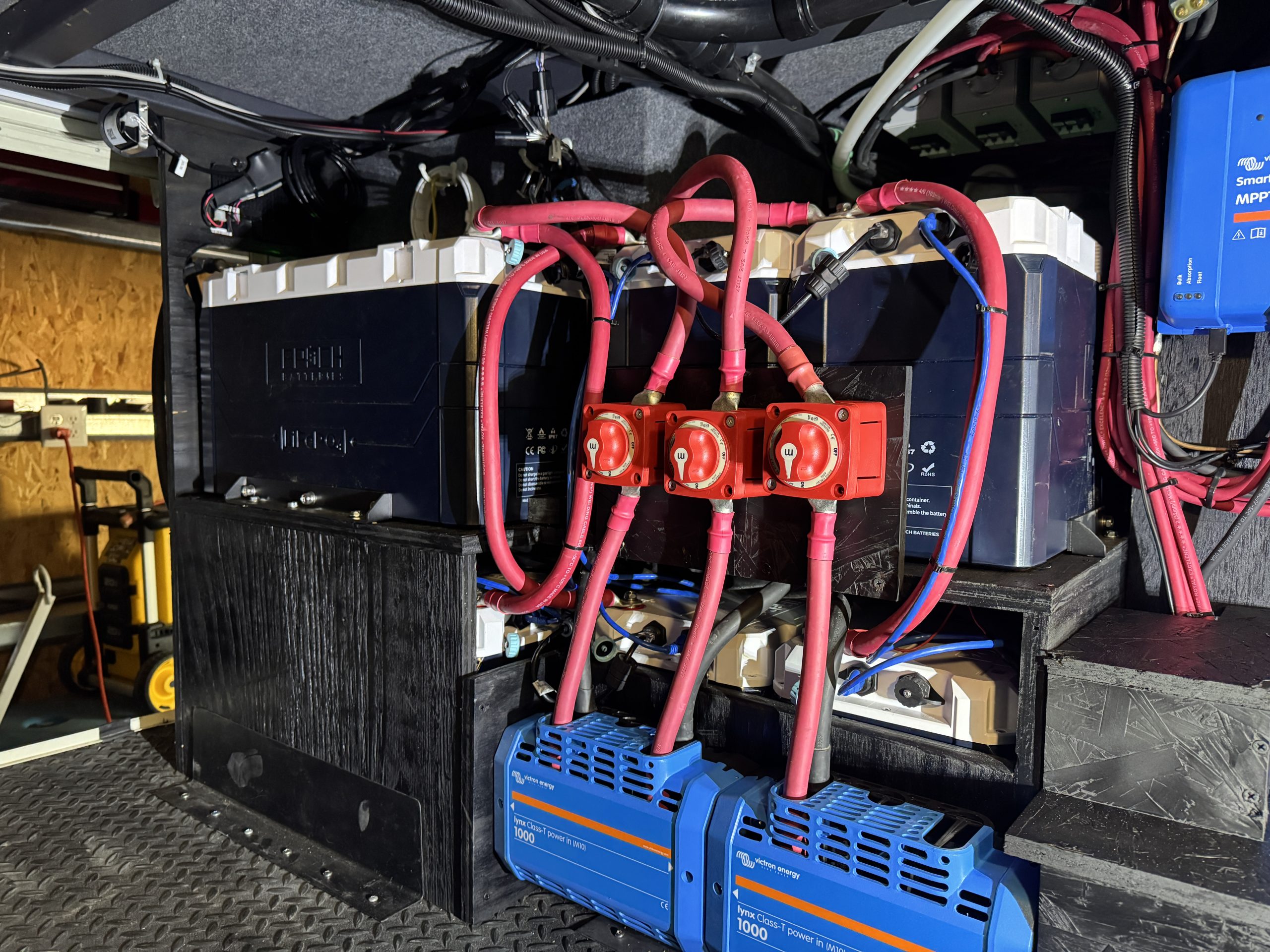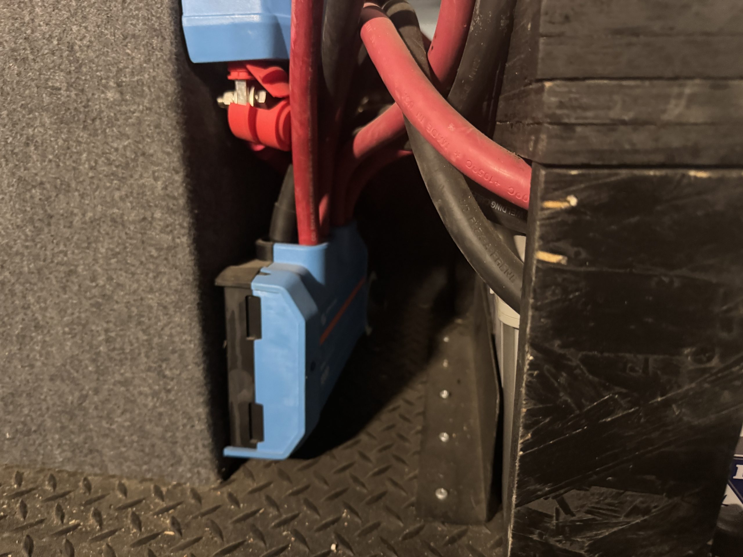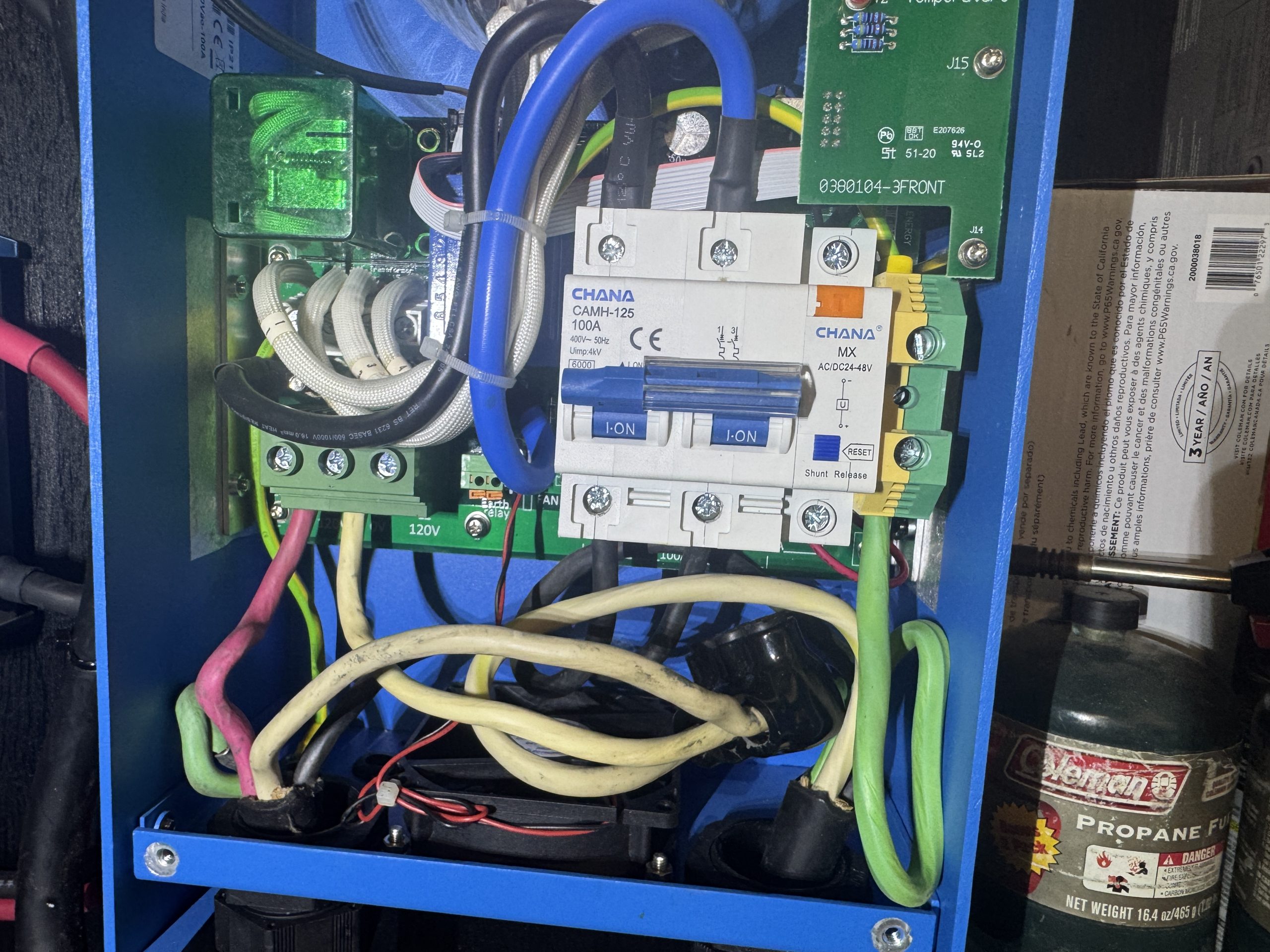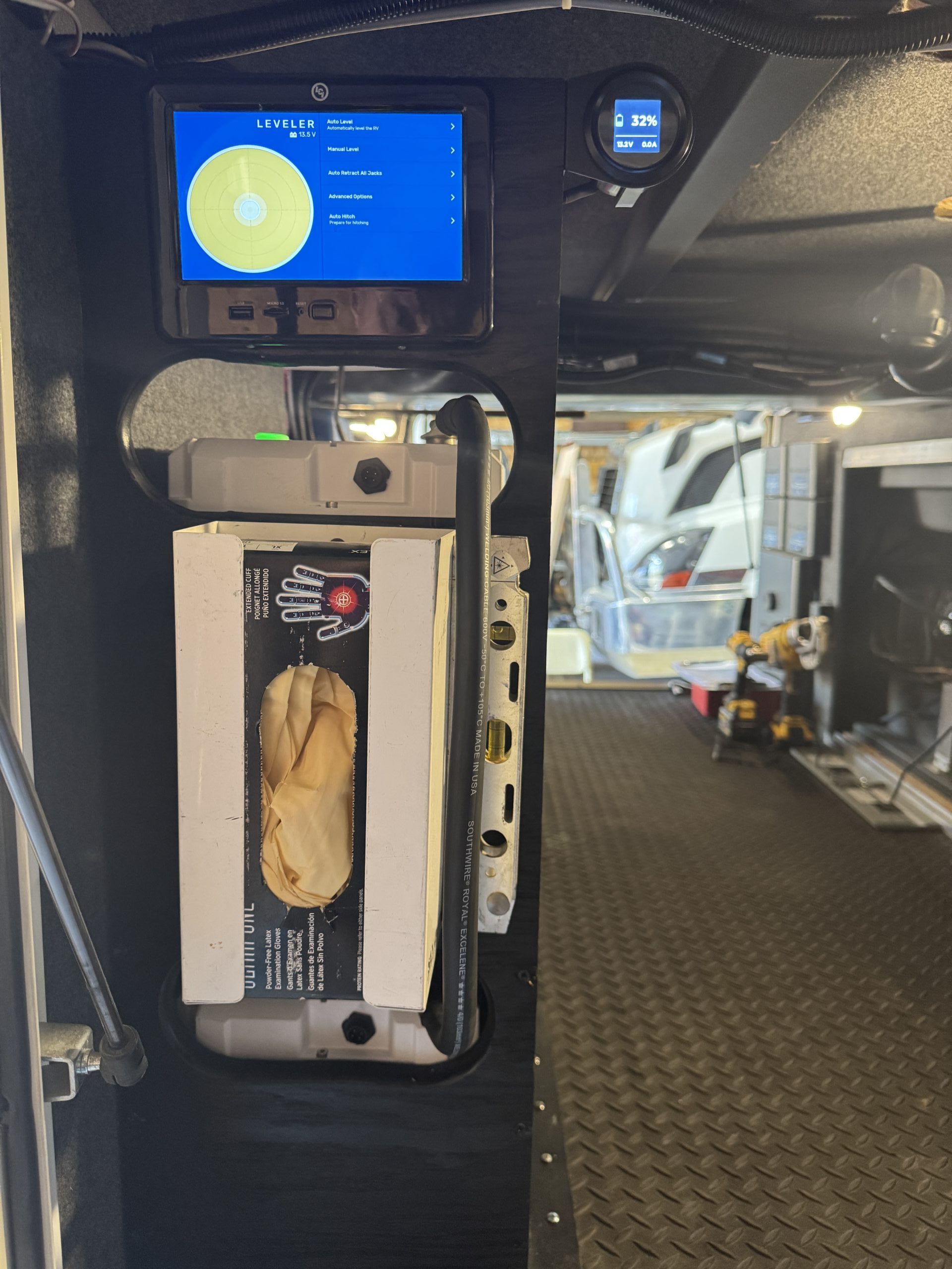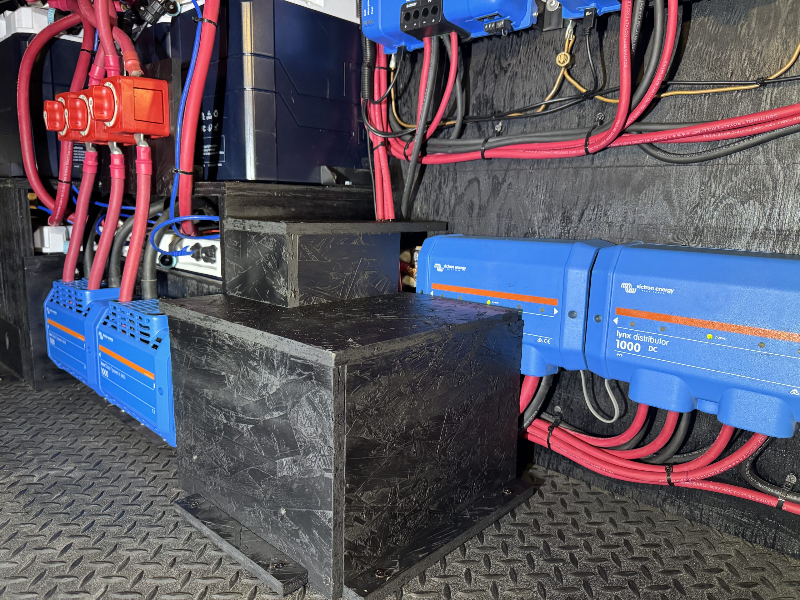 The EPOCH Elite Series batteries require a little more work than most batteries to install properly.  This includes individual firmware updates, setting battery DIP switches for integrated communications and interconnecting all the batteries with communication cables.  The Master battery has a small, remote display attached to the main comms harness that I mounted in the bay with the batteries.  I had to extend the RJ45 cable on the same main comms harness that goes to the Victron GX device to reach the location where I had my Cerbo GX installed.  This was easy to do with a female to female RJ45 adapter and a second Ethernet cable.  I mounted my batteries in stacked pairs.  Unfortunately the interconnect communication cables that come with the batteries weren’t long enough to reach a battery stacked on top of another battery (the cables are designed for side by side installation and reach that configuration perfectly).  As a result, I had to use a couple of standard Victron RJ45 communication cables to reach the longer distance.  This resulted in not having waterproof connectors for those connections (like the factory EPOCH cables have), but this was not a concern for my installation inside a storage compartment in my RV.  I also had to contend with the fact EPOCH batteries have a sophisticated BMS installed to monitor and manage all the features of the Elite series batteries.  When I initially connected the batteries to the rest of the system, the batteries would immediately shut down.  I determined this was because the large capacity capacitors in my dual Quattro 5KVA inverter chargers were drained from lack of DC power and the heavy inrush of DC current trying to fill those capacitors back up made the EPOCH battery BMSs think there was a dead short somewhere.  This resulted in the batteries shutting down to protect against the hazard they were detecting.  This necessitated multiple start up and shut down cycles to slowly charge the capacitors in the Quattros before the batteries would remain on and active.  This could have been avoided by pre-charging the Quattro capacitors, but I did not have the equipment needed to accomplish this task readily available when I hooked the batteries up (I do now so I can avoid this issue in the future).