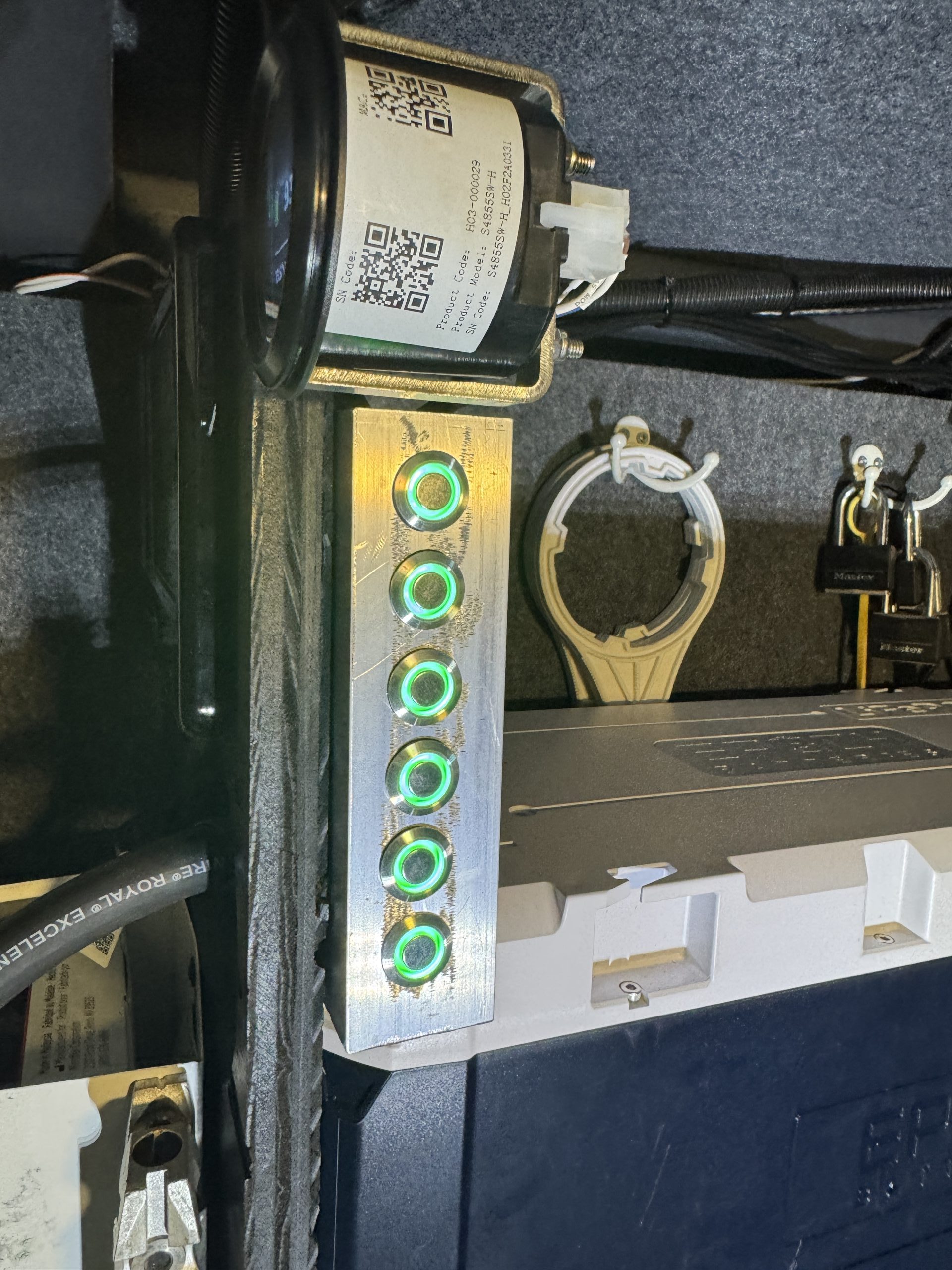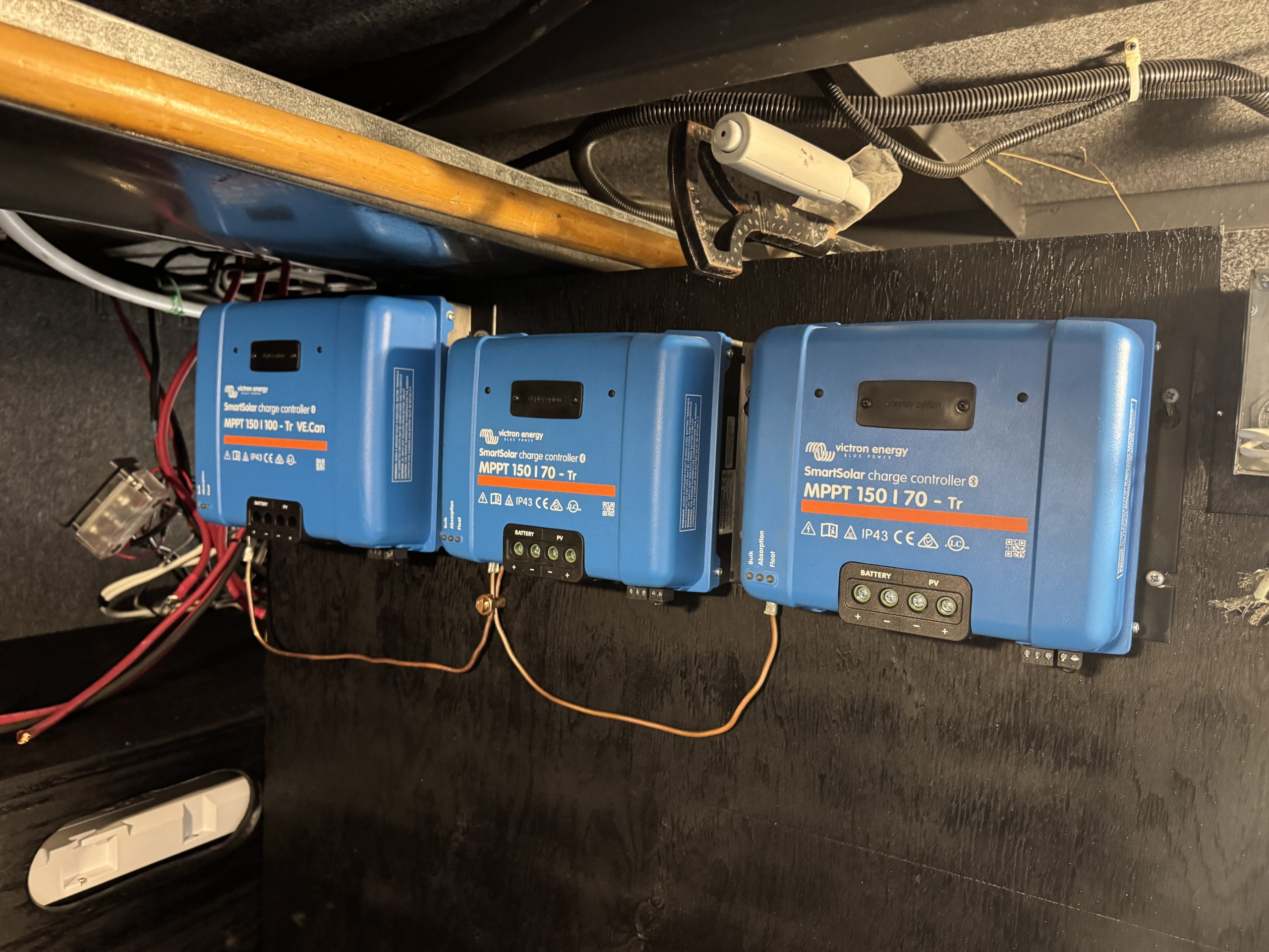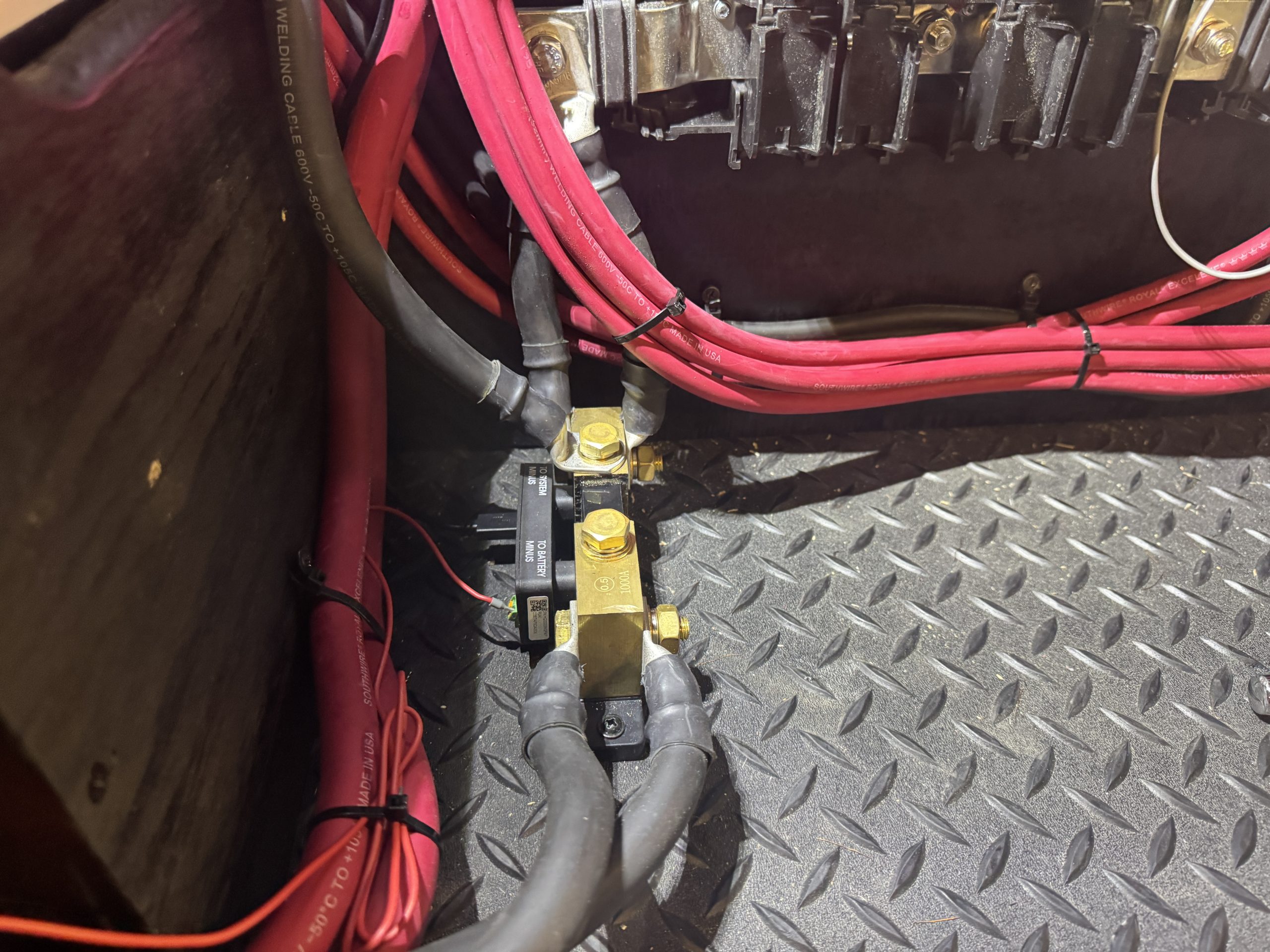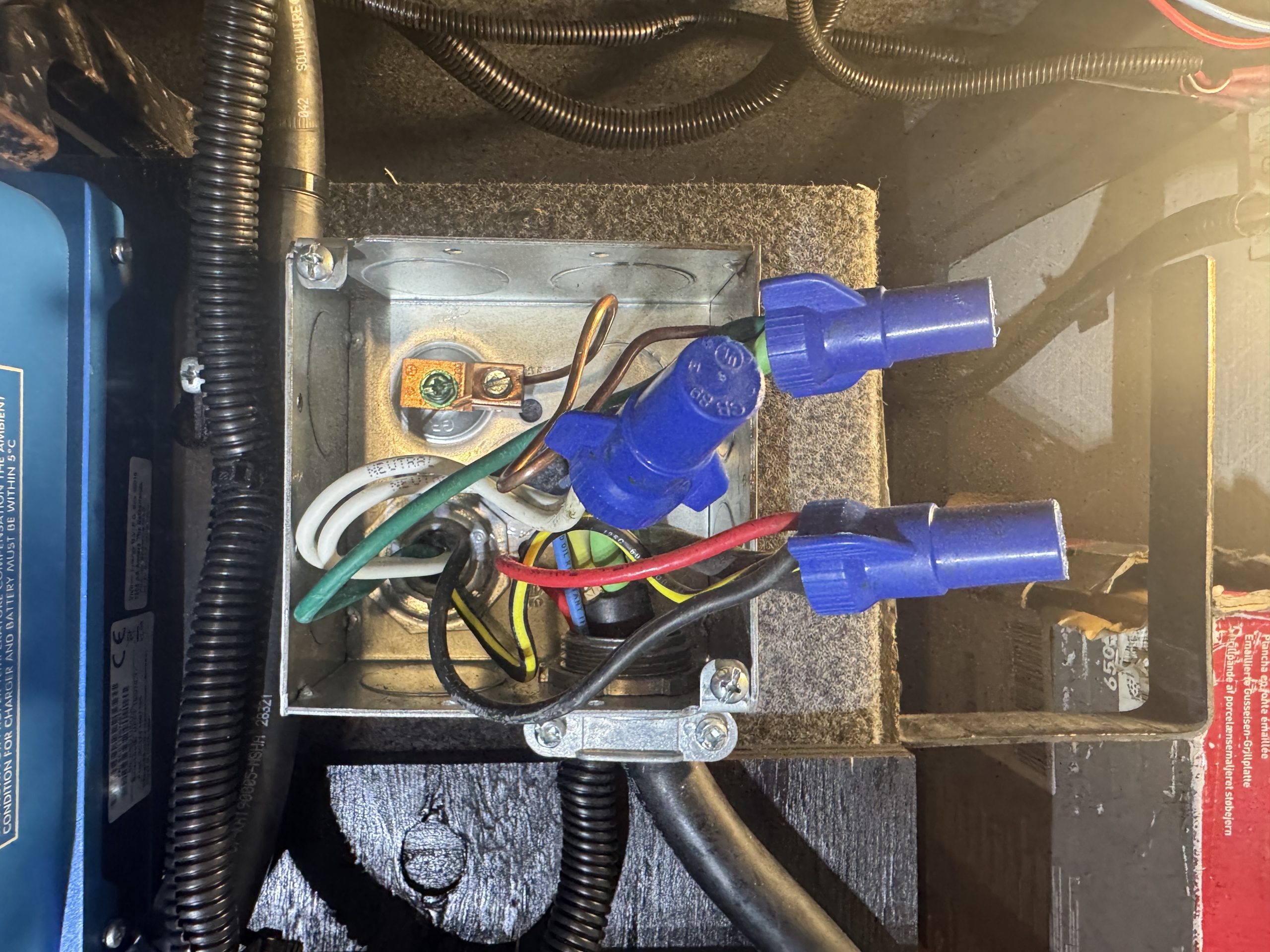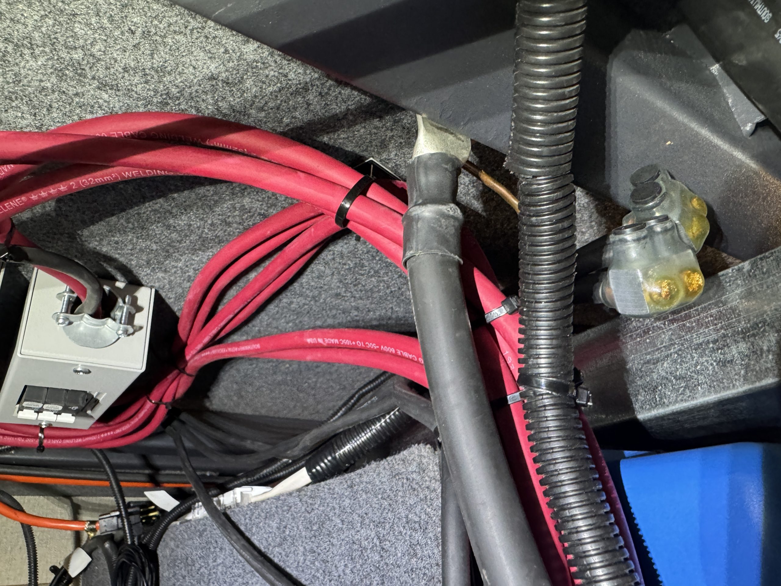 The EPOCH Elite Series batteries require a little more work than most batteries to install properly.  This includes individual firmware updates, setting battery DIP switches for integrated communications and interconnecting all the batteries with communication cables.  The Master battery has a small, remote display attached to the main comms harness that I mounted in the bay with the batteries.  I had to extend the RJ45 cable on the same main comms harness that goes to the Victron GX device to reach the location where I had my Cerbo GX installed.  This was easy to do with a female to female RJ45 adapter and a second Ethernet cable.  I mounted my batteries in stacked pairs.  Unfortunately the interconnect communication cables that come with the batteries weren’t long enough to reach a battery stacked on top of another battery (the cables are designed for side by side installation and reach that configuration perfectly).  As a result, I had to use a couple of standard Victron RJ45 communication cables to reach the longer distance.  This resulted in not having waterproof connectors for those connections (like the factory EPOCH cables have), but this was not a concern for my installation inside a storage compartment in my RV.  I also had to contend with the fact EPOCH batteries have a sophisticated BMS installed to monitor and manage all the features of the Elite series batteries.  When I initially connected the batteries to the rest of the system, the batteries would immediately shut down.  I determined this was because the large capacity capacitors in my dual Quattro 5KVA inverter chargers were drained from lack of DC power and the heavy inrush of DC current trying to fill those capacitors back up made the EPOCH battery BMSs think there was a dead short somewhere.  This resulted in the batteries shutting down to protect against the hazard they were detecting.  This necessitated multiple start up and shut down cycles to slowly charge the capacitors in the Quattros before the batteries would remain on and active.  This could have been avoided by pre-charging the Quattro capacitors, but I did not have the equipment needed to accomplish this task readily available when I hooked the batteries up (I do now so I can avoid this issue in the future).
