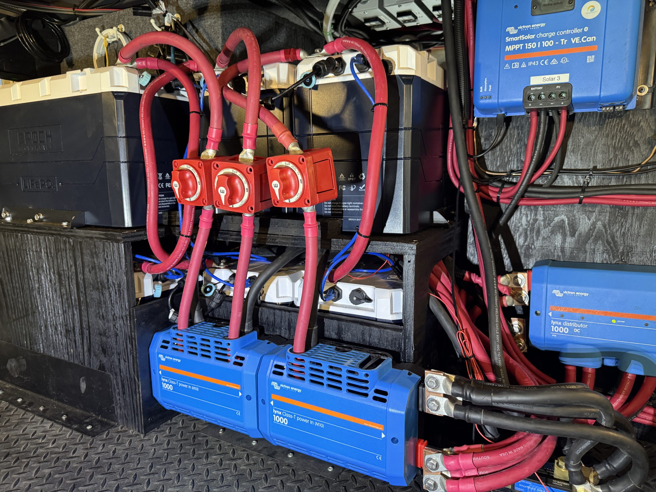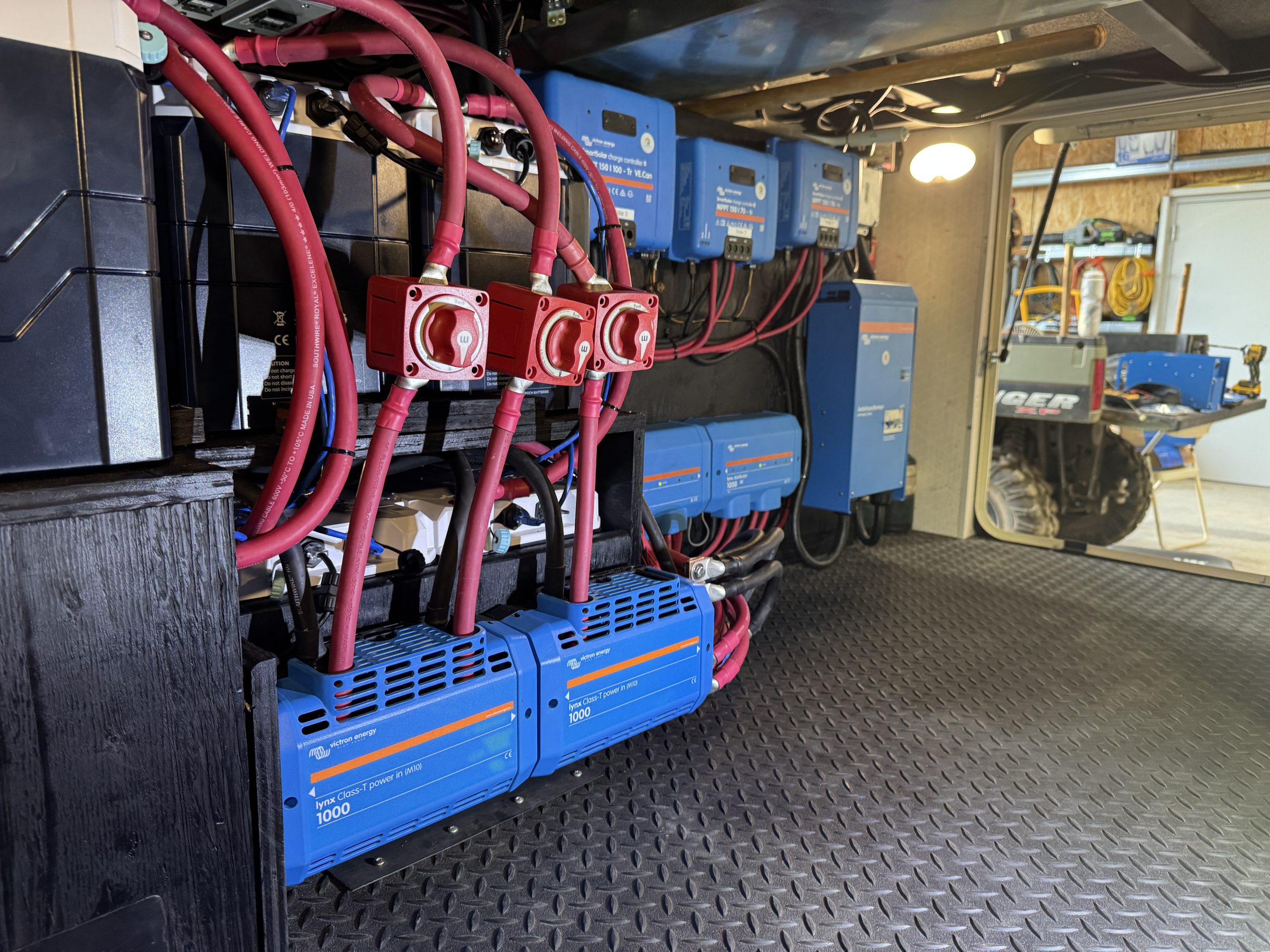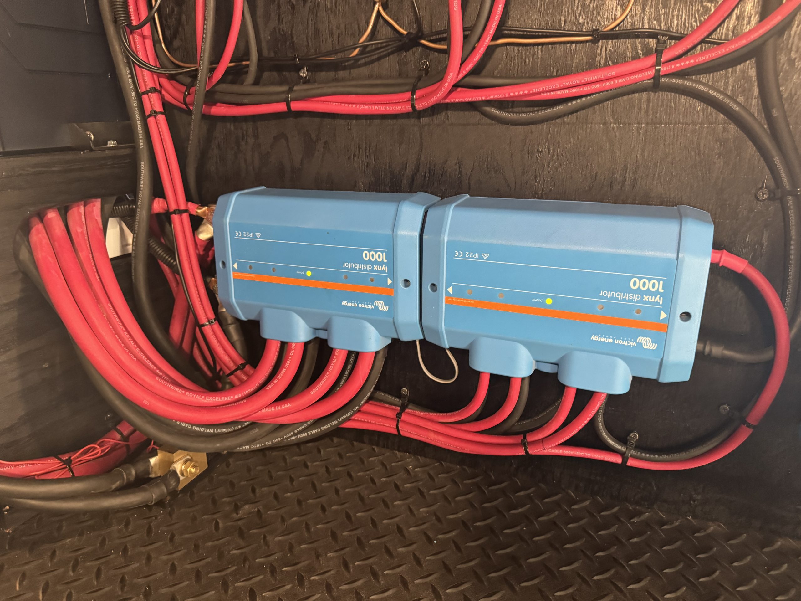 Update 9-1-2025:  I did a quick update to the system. I removed the single Lynx Power In and replaced it with two Class T Lynx Power Ins. The battery pairs now connect to the Class T Power Ins with 350 amp Class T fuses for each pair of batteries. I also removed the single Blue Sea HD 3000 on/off switch and replaced it with three Blue Sea 6006 on/off switches. The switches are in the positive cable of each battery pair going to the Lynx Class T Power ins. These changes give me more protection for the batteries and more input/output capacity for the system (no longer limited to the single 3000 HD switch capacity).  As part of this update, I also upgraded from two sets of 4/0 cable between the Power Ins and the Distributors to four sets of 4/0 cables (four positive cables and four negative cables).  These cables connect to the ends of the last Class T Lynx Power In and go to the ends of the first Lynx Distributor.  The negative cables go through a 1000 amp SmartShunt.  In order to make room to connect four 4/0 cable lugs to the ends of the Power In and the Distributor, I added 1″ x 1/4″ copper busbar to each bus bar end on the Power In and the Distributor.  This allowed for the added connection space for the cable lugs.  It would have been nice to use a Lynx Shunt between the Power Ins and the Distributors, but the installation space did not allow for that.  With four sets of 4/0 cables between the Power Ins and the Distributors, the cables barely get warm under heavy extended charge or extended heavy load.  With the battery capacity I now have, it is easy to run heavy loads (300+ amps of current) for extended periods and with the dual 220 amp chargers in the Quattros, it is easy to charge at high current (300+ amps) for extended periods.  Even after hours of loads like this, the cables are perfectly happy with no significant heat build up.