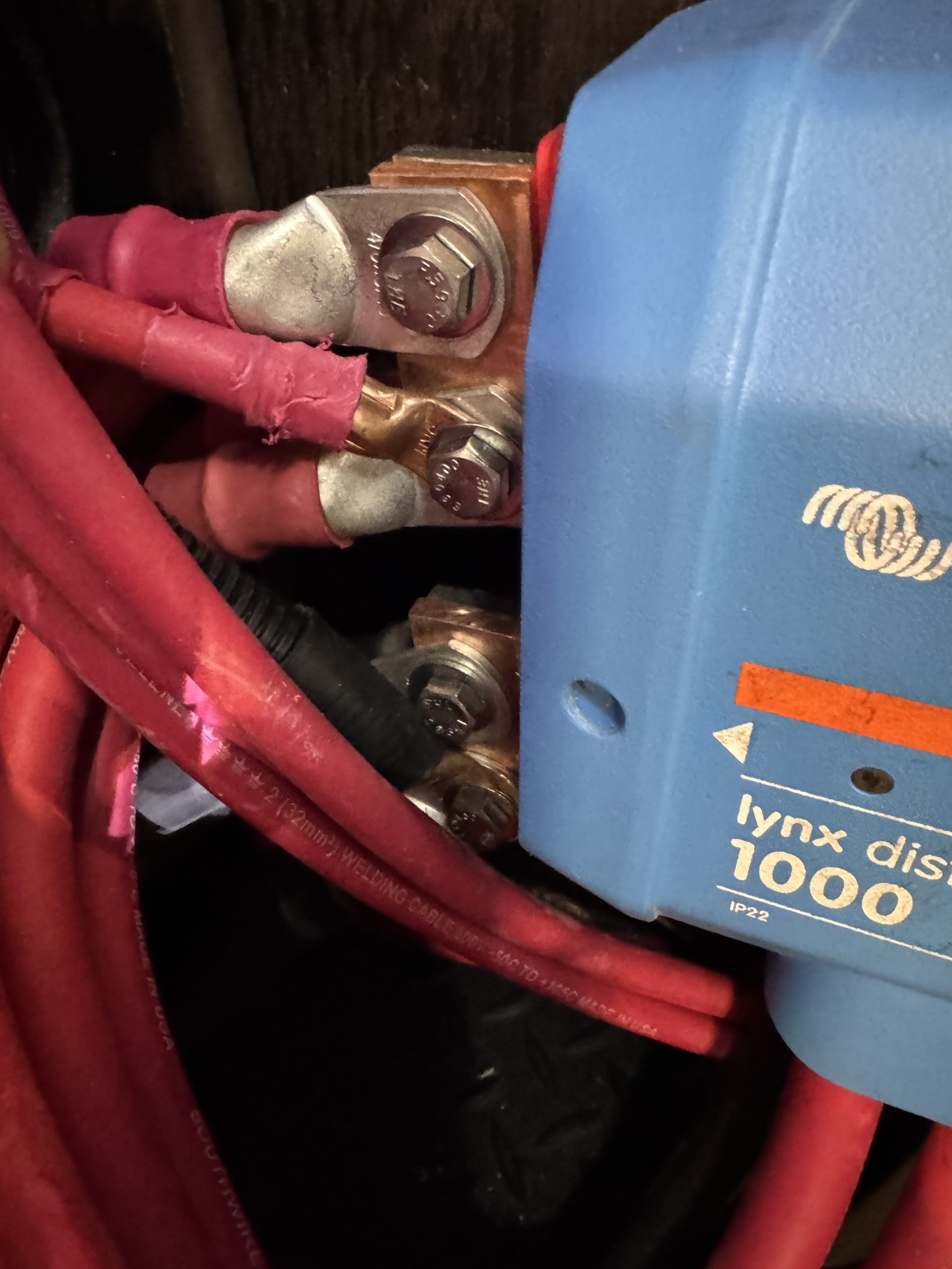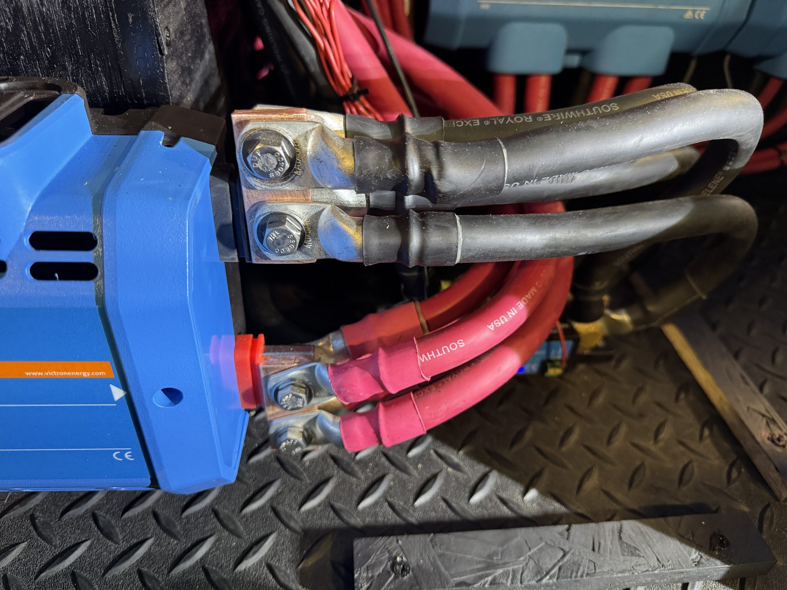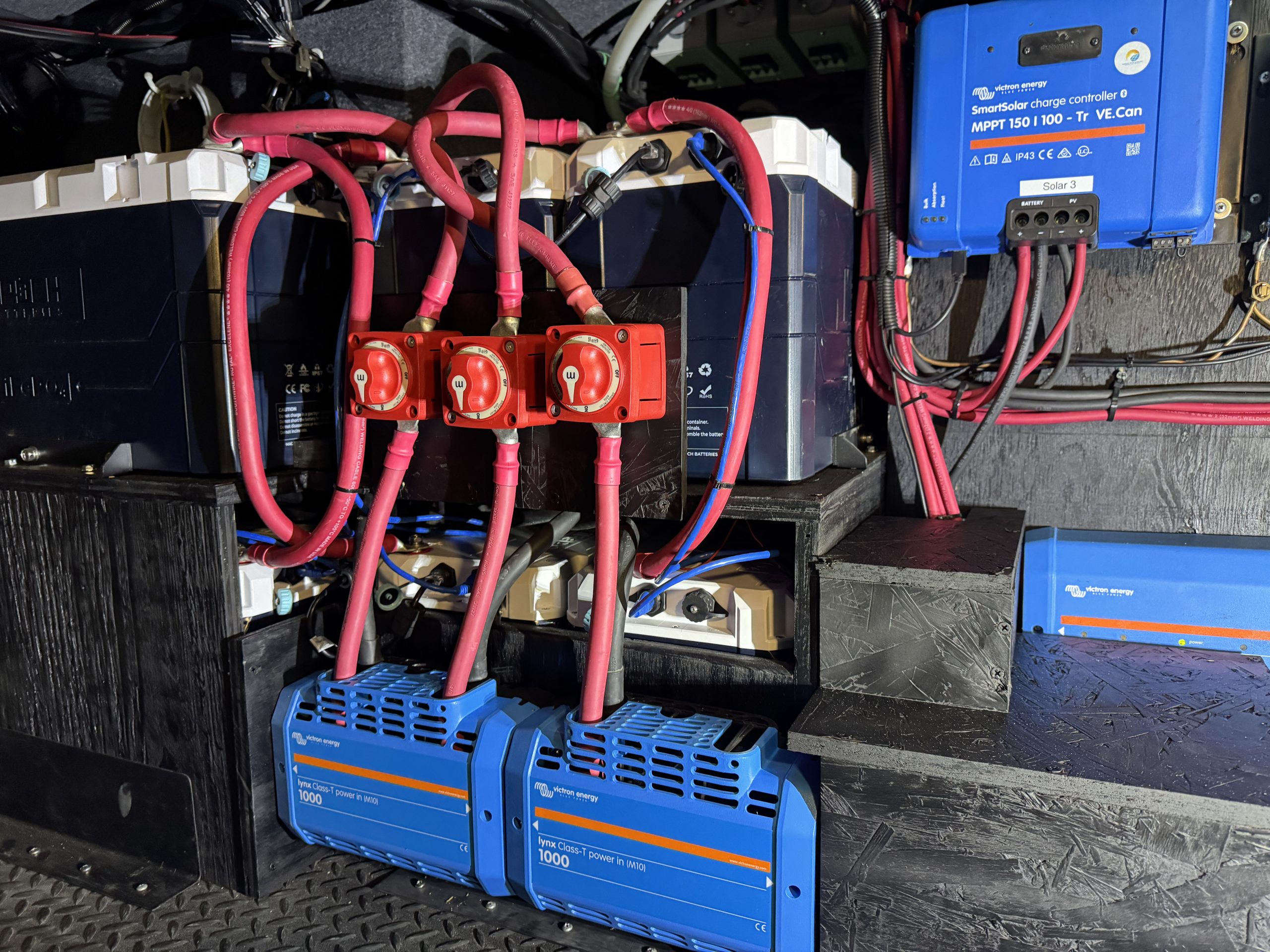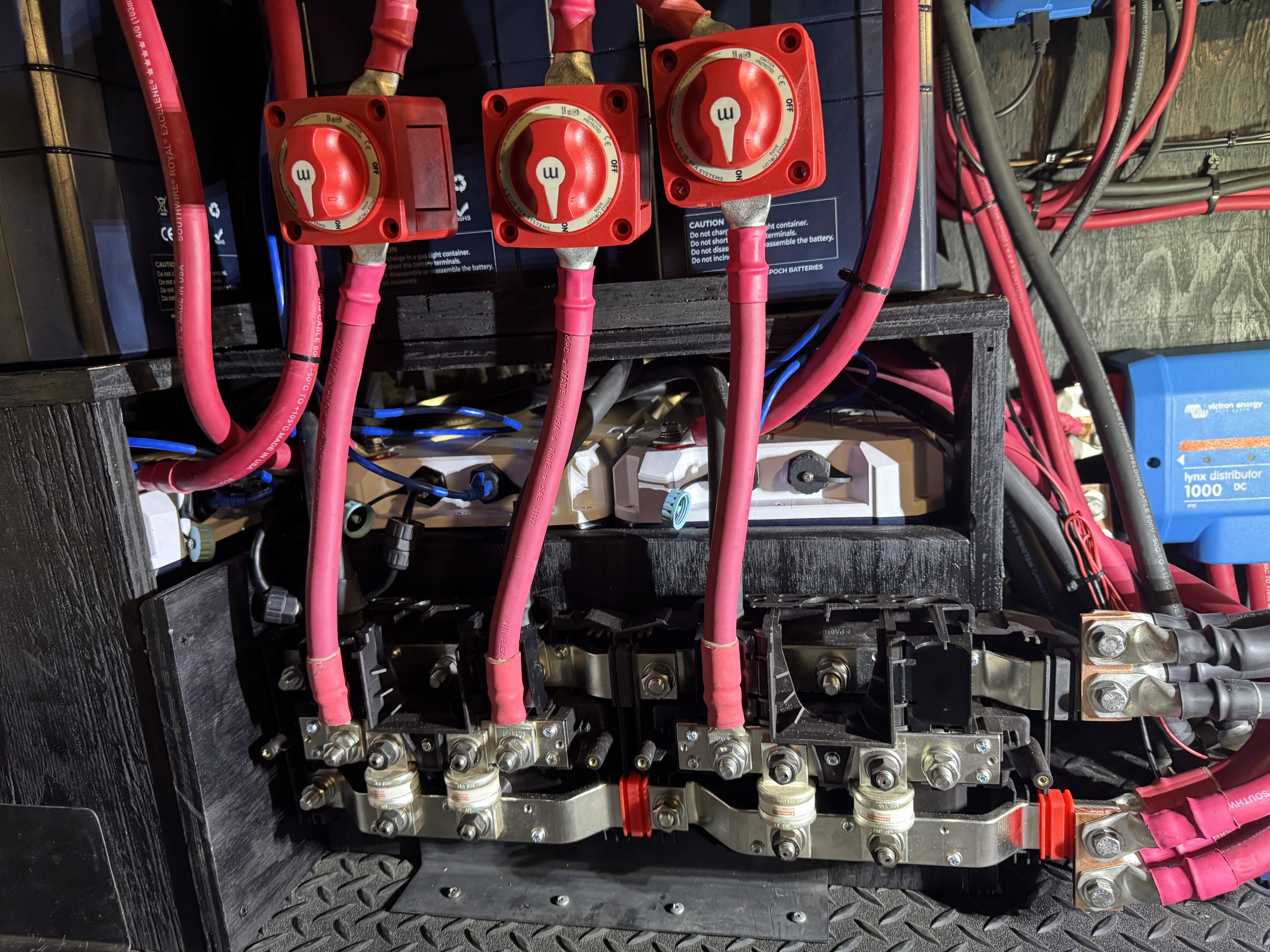 Update 9-1-2025:  I did a quick update to the system. I removed the single Lynx Power In and replaced it with two Class T Lynx Power Ins. The battery pairs now connect to the Class T Power Ins with 350 amp Class T fuses for each pair of batteries. I also removed the single Blue Sea HD 3000 on/off switch and replaced it with three Blue Sea 6006 on/off switches. The switches are in the positive cable of each battery pair going to the Lynx Class T Power ins. These changes give me more protection for the batteries and more input/output capacity for the system (no longer limited to the single 3000 HD switch capacity).  As part of this update, I also upgraded from two sets of 4/0 cable between the Power Ins and the Distributors to four sets of 4/0 cables (four positive cables and four negative cables).  These cables connect to the ends of the last Class T Lynx Power In and go to the ends of the first Lynx Distributor.  The negative cables go through a 1000 amp SmartShunt.  In order to make room to connect four 4/0 cable lugs to the ends of the Power In and the Distributor, I added 1″ x 1/4″ copper busbar to each bus bar end on the Power In and the Distributor.  This allowed for the added connection space for the cable lugs.  It would have been nice to use a Lynx Shunt between the Power Ins and the Distributors, but the installation space did not allow for that.  With four sets of 4/0 cables between the Power Ins and the Distributors, the cables barely get warm under heavy extended charge or extended heavy load.  With the battery capacity I now have, it is easy to run heavy loads (300+ amps of current) for extended periods and with the dual 220 amp chargers in the Quattros, it is easy to charge at high current (300+ amps) for extended periods.  Even after hours of loads like this, the cables are perfectly happy with no significant heat build up.