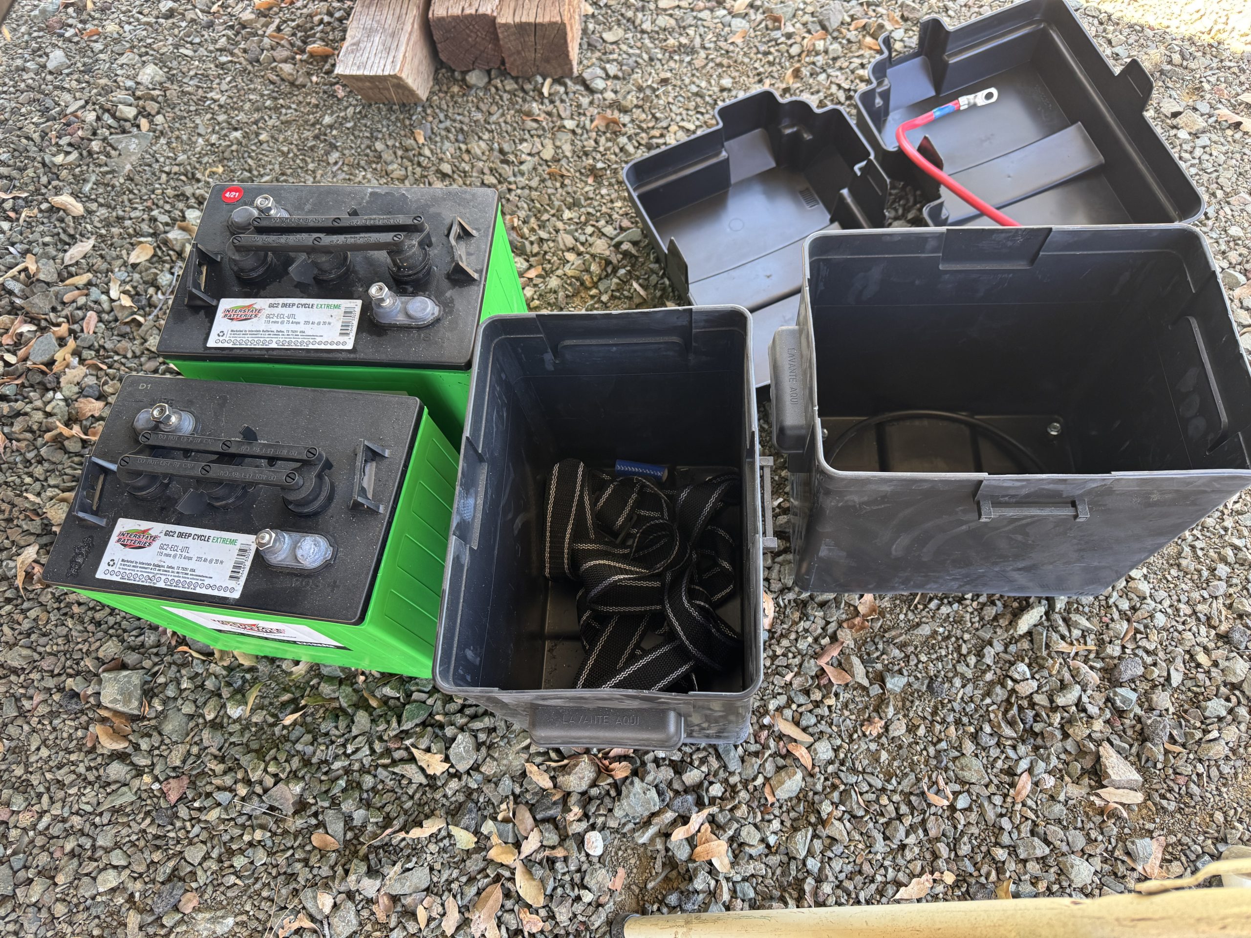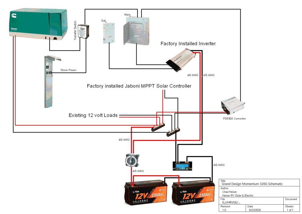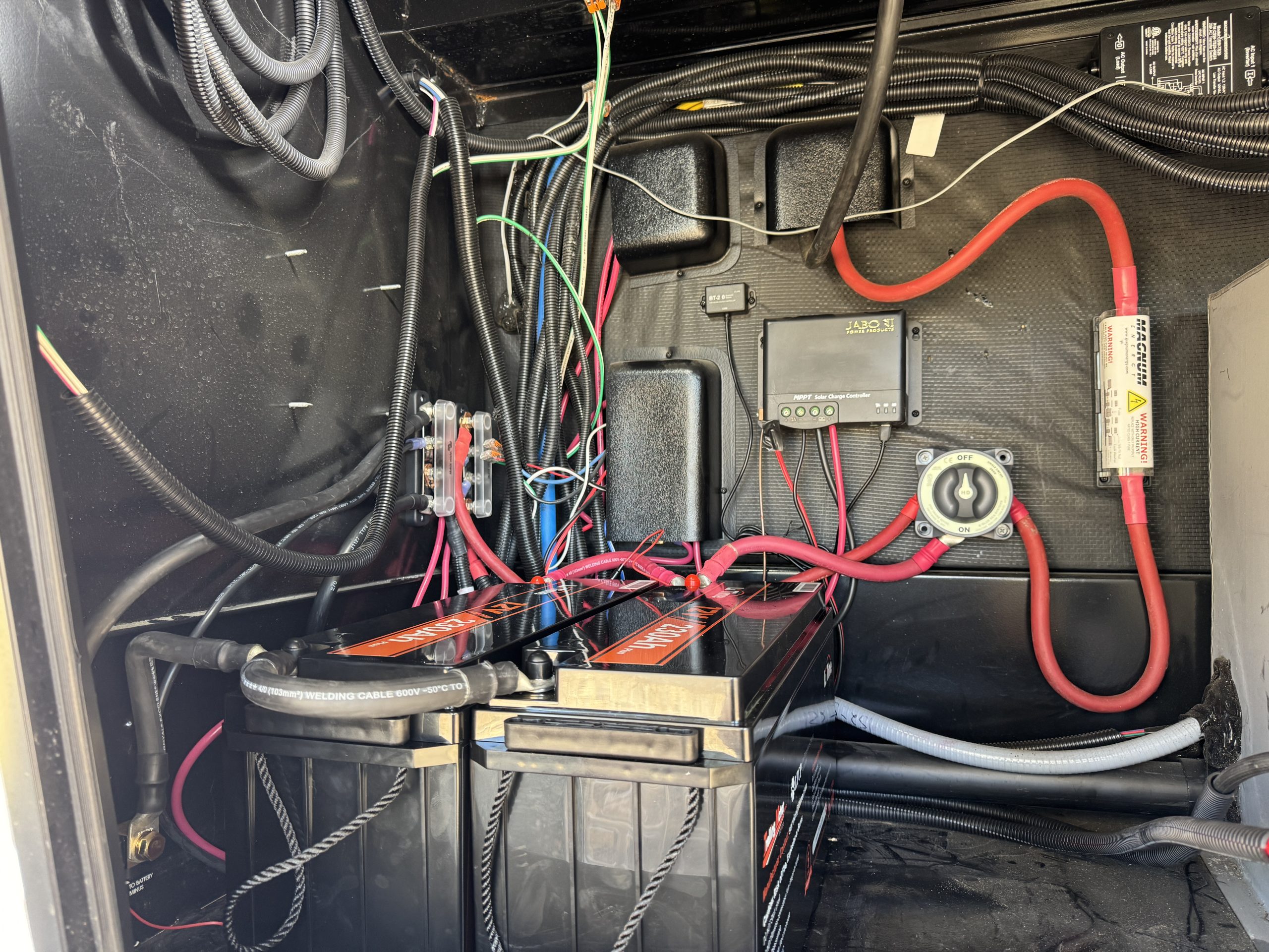 This installation was completed in August of 2025. The customer had very basic power needs and a limited budget. The RV had a factory installed solar panel with a Jaboni MPPT charge controller and a Magnum 2000 watt inverter. The customer simply wanted to upgrade the two six volt lead acid batteries to Lithium batteries with a battery monitor and replace the factory converter (that was not lithium compatible) with a lithium compatible converter. The customer also wanted to move the inverter on/off switch from the basement wall (where the factory installed it) to somewhere inside the RV so they did not have to go outside to turn the inverter on/off. I talked to the customer about various options and we came up with a plan to meet their needs. The customer chose to purchase two LiTime 230 amp hour lithium batteries for me to install. We set an installation appointment and the customer brought the RV to me for the installation.