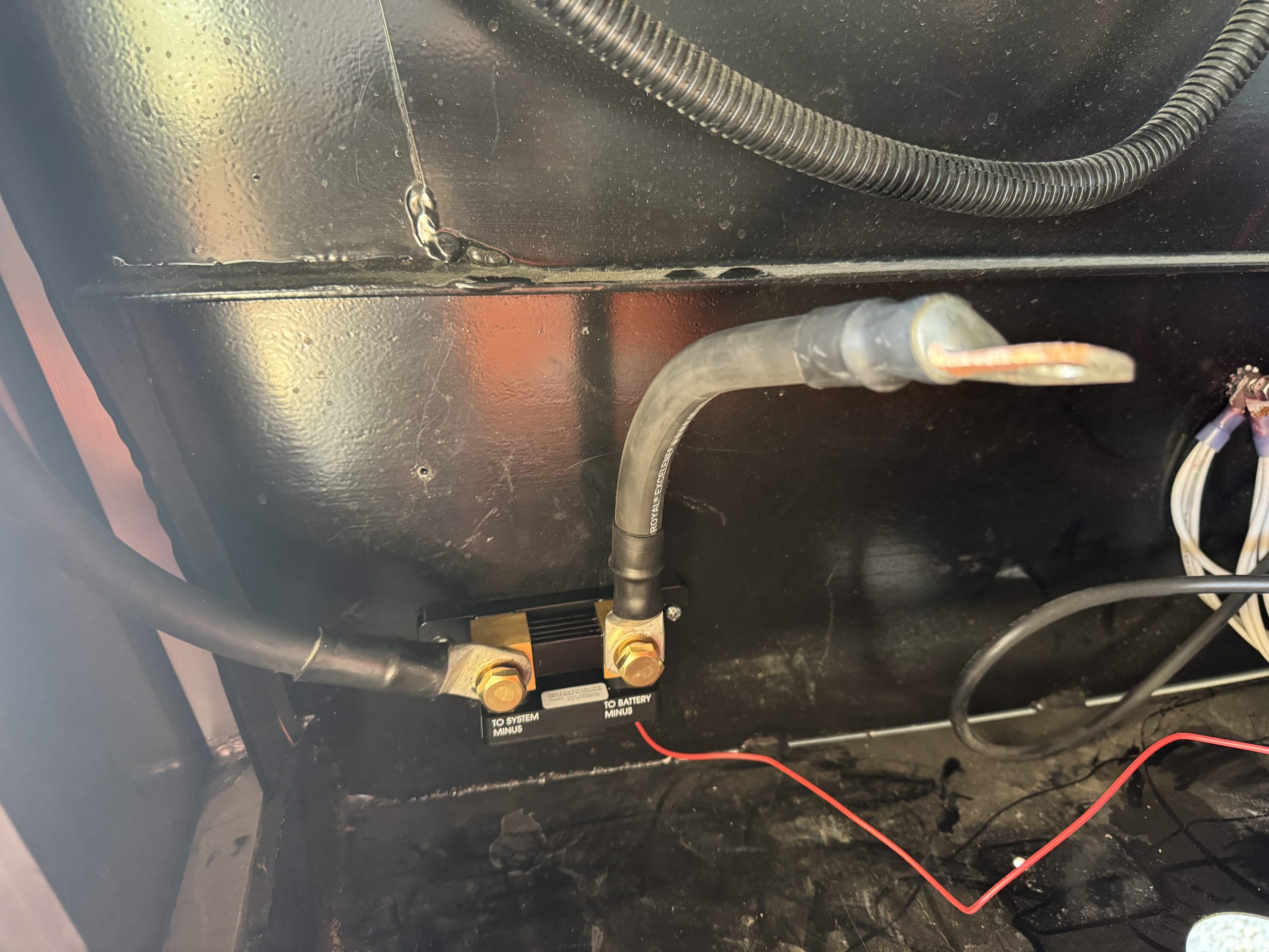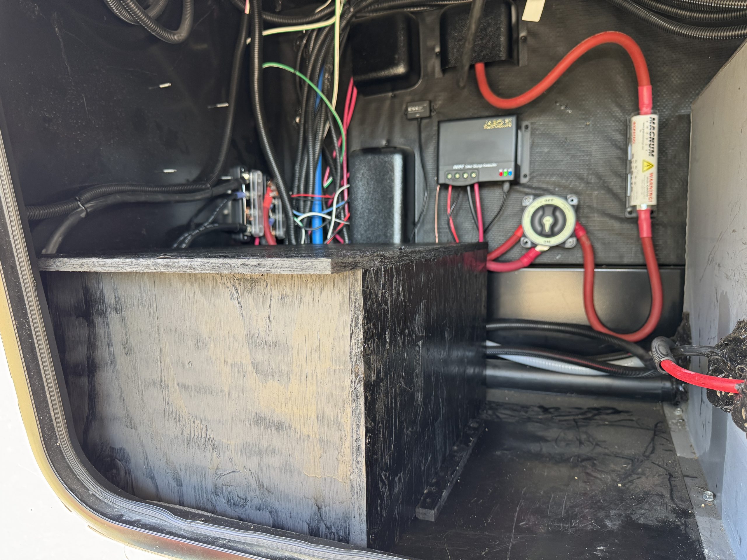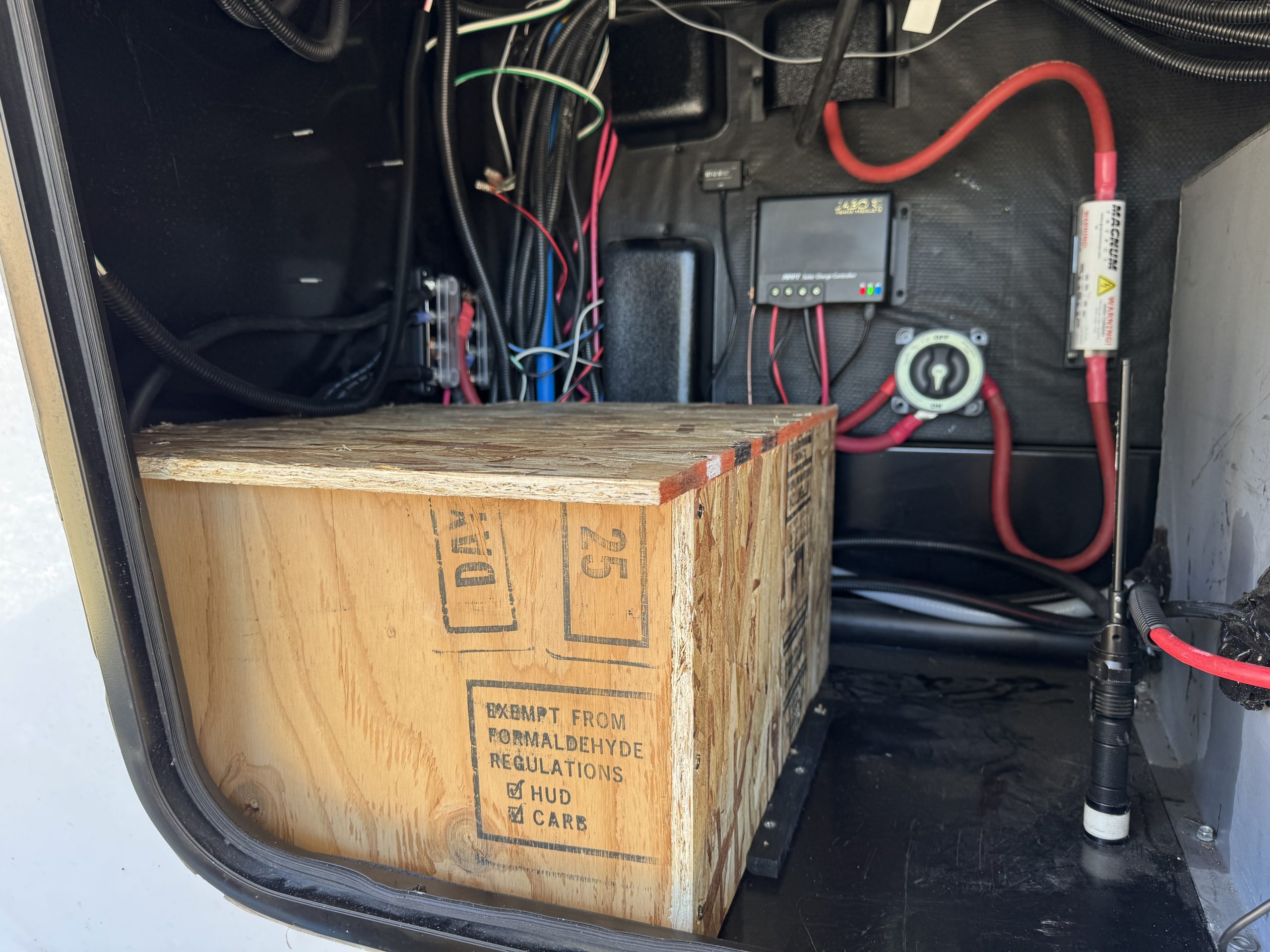The installation was completed in a single day and was pretty easy. I removed the old batteries and installed the customer provided LiTime lithium batteries. I made up new battery cables to connect the batteries to the RV and added a Victron 500 amp Smart Shunt to monitor the battery bank. I also added a Blue Sea 3000 HD on/off switch to allow the customer to easily isolate the battery bank from the RV for storage or maintenance. I moved all the OEM battery connections to a set of Victron bus bars that I installed in the battery compartment. I built a battery box to cover the new batteries and allow the customer to store items on top of them if necessary. I then replaced the factory installed converter with a Progressive Dynamics 9360 lithium compatible converter. Finally, i moved the simple inverter on/off remote switch from the basement wall where it was installed by the factory to an interior wall. This posed a bit of an issuethough, because the data cable for the switch was very short. These remote switches typically have 15-20 feet of cable atached to them to allow for convenient remote mounting. When I went to move this switch, i found it only had approximately 5 feet of cable attached to it. This greatly limited the options for placement of the switch on the interior of the RV. I was able to find a location down low on the stairwell wall leading to the bedroom of the RV that just reached the limited cable length available. Finally, I checked all the connections in the RV main breaker panel (at the customer’s request) to make sure everything was secure.