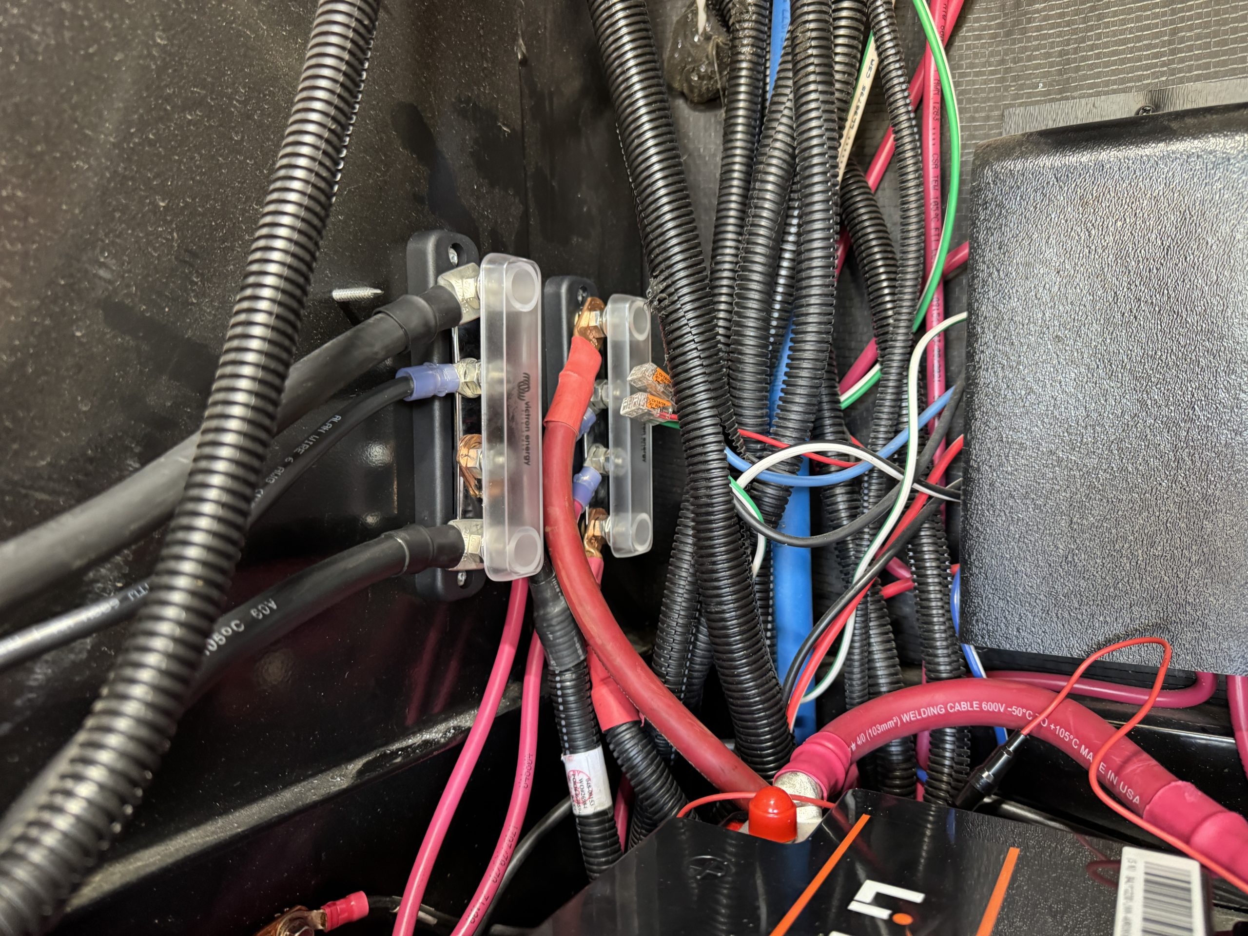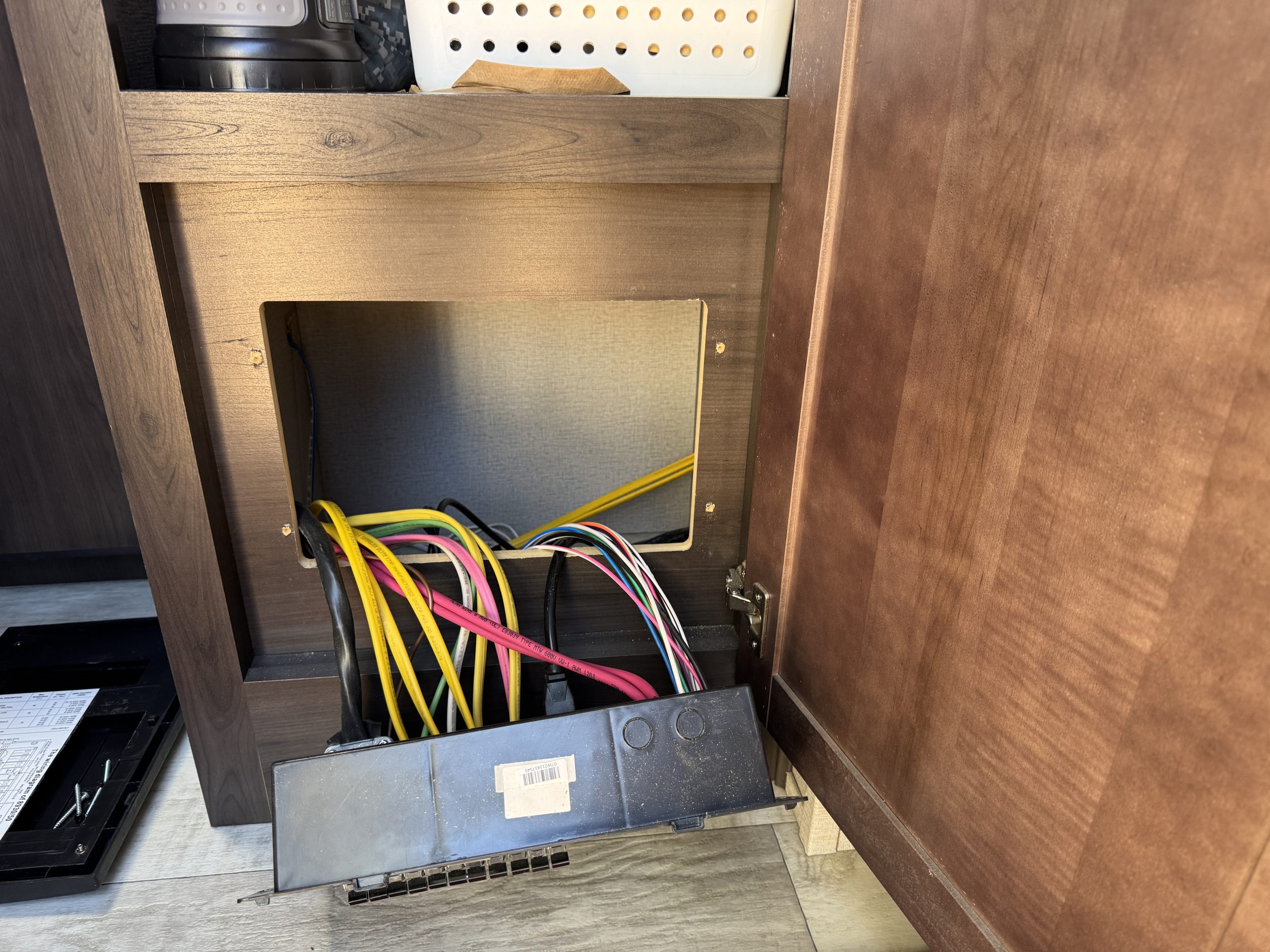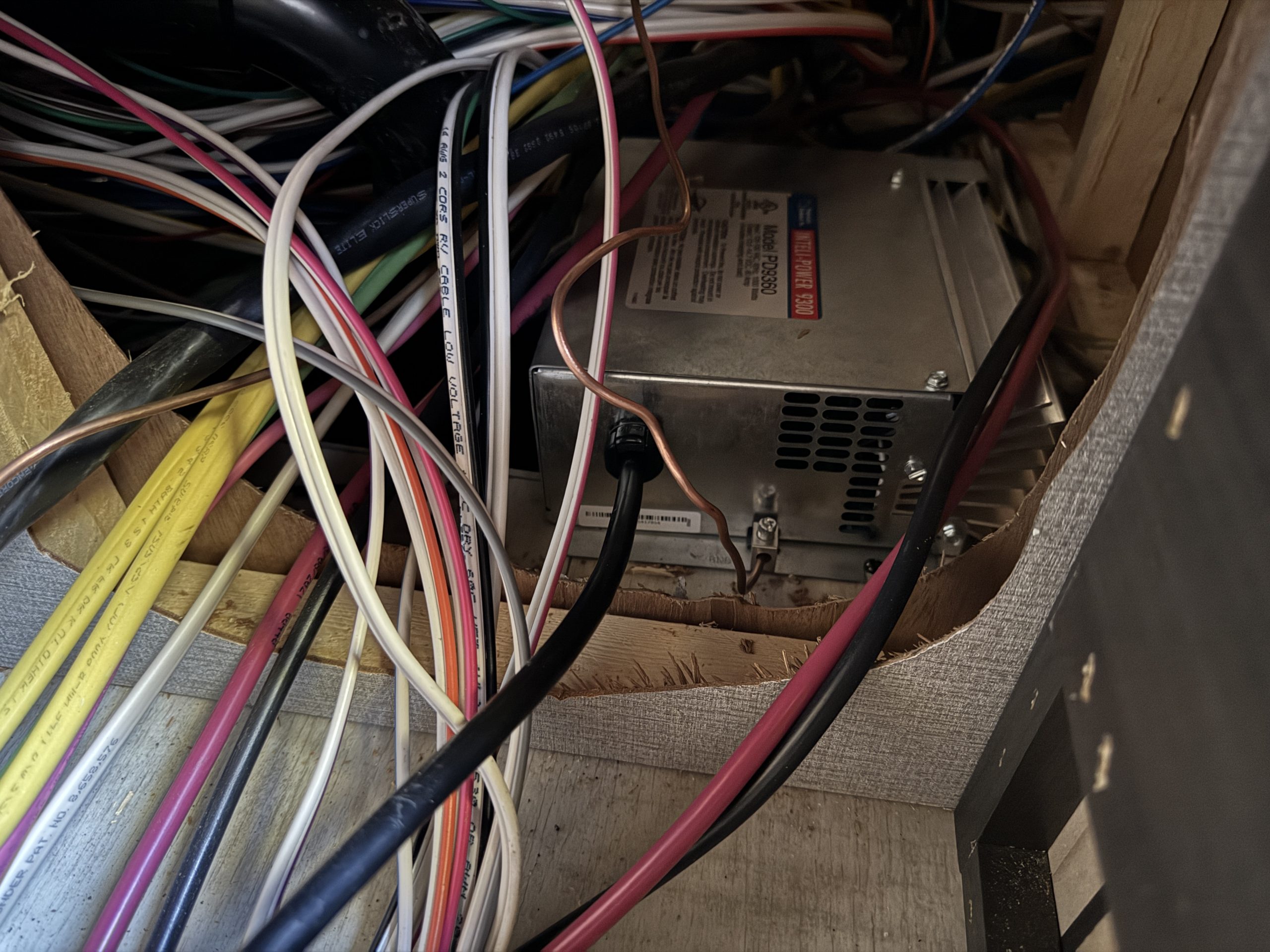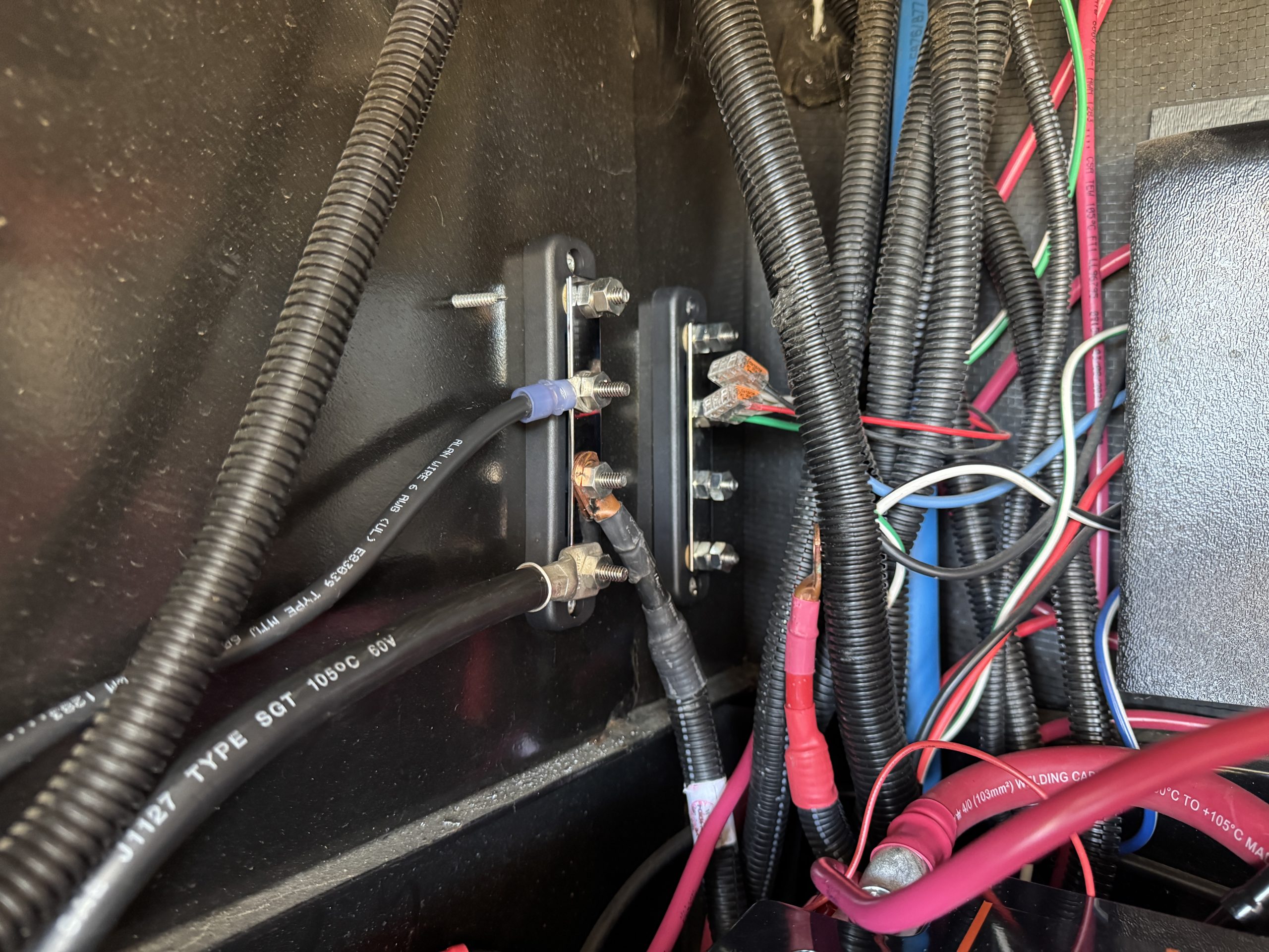 The installation was completed in a single day and was pretty easy. I removed the old batteries and installed the customer provided LiTime lithium batteries. I made up new battery cables to connect the batteries to the RV and added a Victron 500 amp Smart Shunt to monitor the battery bank. I also added a Blue Sea 3000 HD on/off switch to allow the customer to easily isolate the battery bank from the RV for storage or maintenance. I moved all the OEM battery connections to a set of Victron bus bars that I installed in the battery compartment. I built a battery box to cover the new batteries and allow the customer to store items on top of them if necessary. I then replaced the factory installed converter with a Progressive Dynamics 9360 lithium compatible converter. Finally, i moved the simple inverter on/off remote switch from the basement wall where it was installed by the factory to an interior wall. This posed a bit of an issuethough, because the data cable for the switch was very short. These remote switches typically have 15-20 feet of cable atached to them to allow for convenient remote mounting. When I went to move this switch, i found it only had approximately 5 feet of cable attached to it. This greatly limited the options for placement of the switch on the interior of the RV. I was able to find a location down low on the stairwell wall leading to the bedroom of the RV that just reached the limited cable length available. Finally, I checked all the connections in the RV main breaker panel (at the customer’s request) to make sure everything was secure.